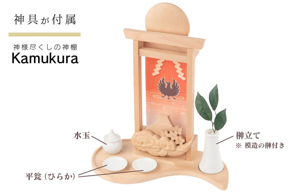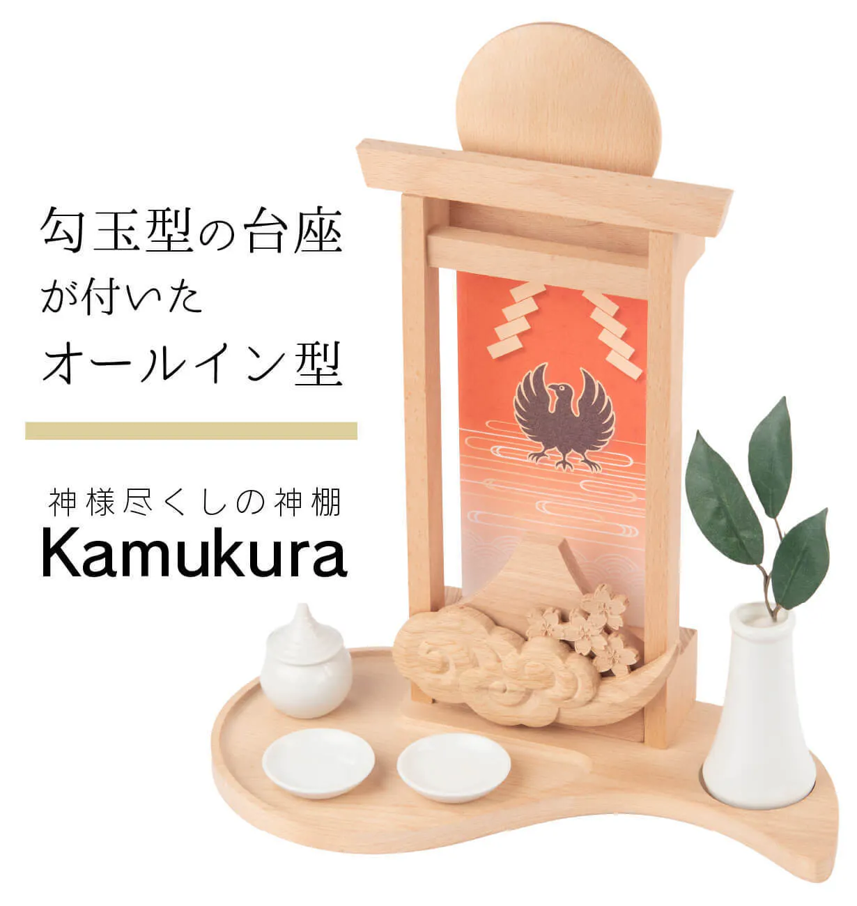 『神様尽くしの神棚 Kamukura』は、『神様尽くしの神棚』に勾玉型の台座、土器(水玉・平瓮2枚・榊立て)、榊(模造)が付属する高級仕様となります。