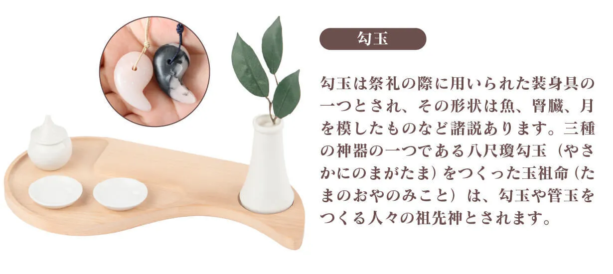 『神様尽くしの神棚 Kamukura』には勾玉型の台座と土器(どき)と呼ばれる神具が付属しておりますので、床の間やキャビネットの上などにお祀りください。