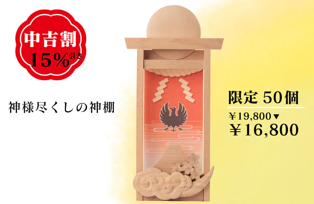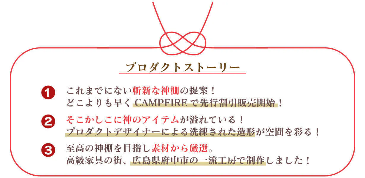神様尽くしの神棚をより多くの人にお求めいただくために、各種リターンをご用意いたしました。