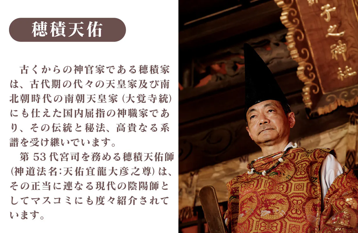 古くからの神官家である穂積家は、古代期の代々の天皇家及び南北朝時代の南朝天皇家(大覚寺統)にも仕えた国内屈指の神職家であり、その伝統と秘法、高貴なる系譜を受け継いでいます。第53代宮司を務める穂積天佑師(神道法名:天佑宜龍大彦之尊)は、その正当に連なる現代の陰陽師としてマスコミにも度々紹介されています。