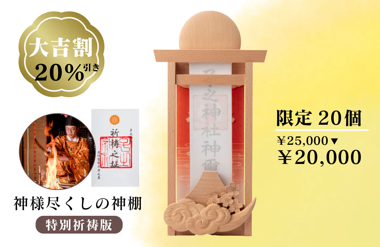 しかし、『神様尽くしの神棚』では、より特別な神社の御神札をお祀りしたいというご要望にお応えするため、1300年を超える歴史を誇る子之神社(神奈川県湯河原町)の穂積天佑師の御祈祷を授かった特別祈祷版もご用意しました。