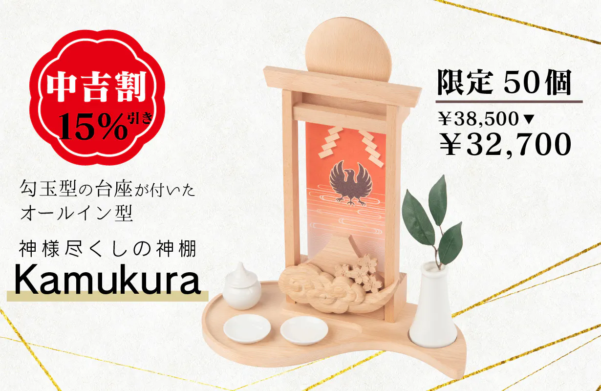 標準仕様の『神様尽くしの神棚』は、現代の住空間にマッチしたコンパクト設計ですが、より本格的なものをお求めの方におすすめするのが『神様尽くしの神棚 Kamukura』です。