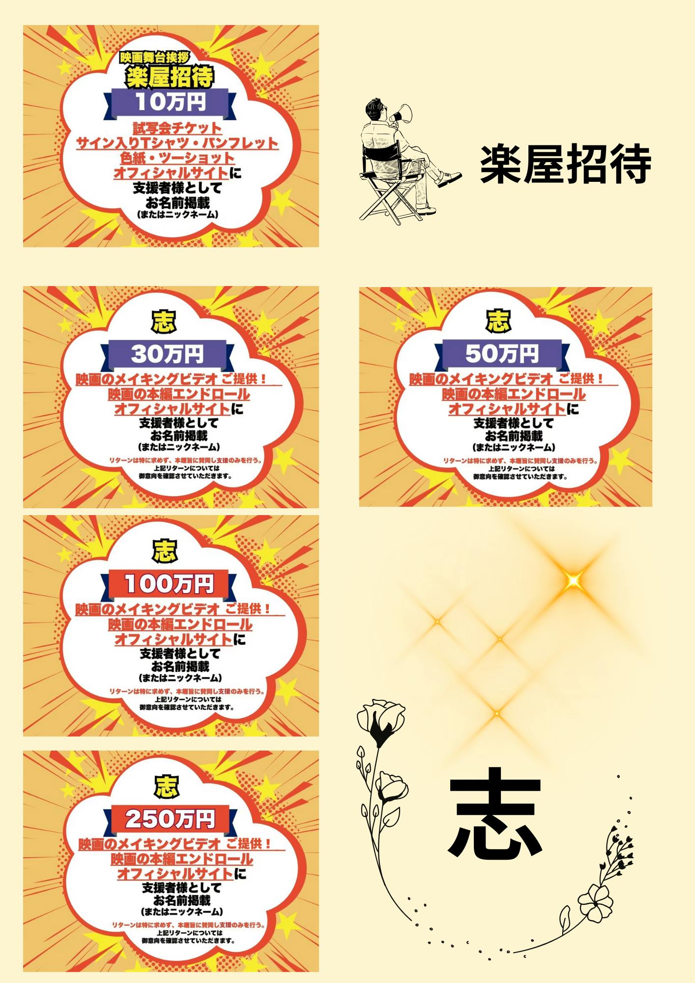 【志30】30万円、【志50】50万円、【志100】100万円、【志250】250万円のリターンは、お名前掲載の文字の大きさが多少異なりますが、全て同じ内容になります。リターン内容が同じでも、リターン価格が異なりますことをご了承の上で、ご支援をお願い致します。