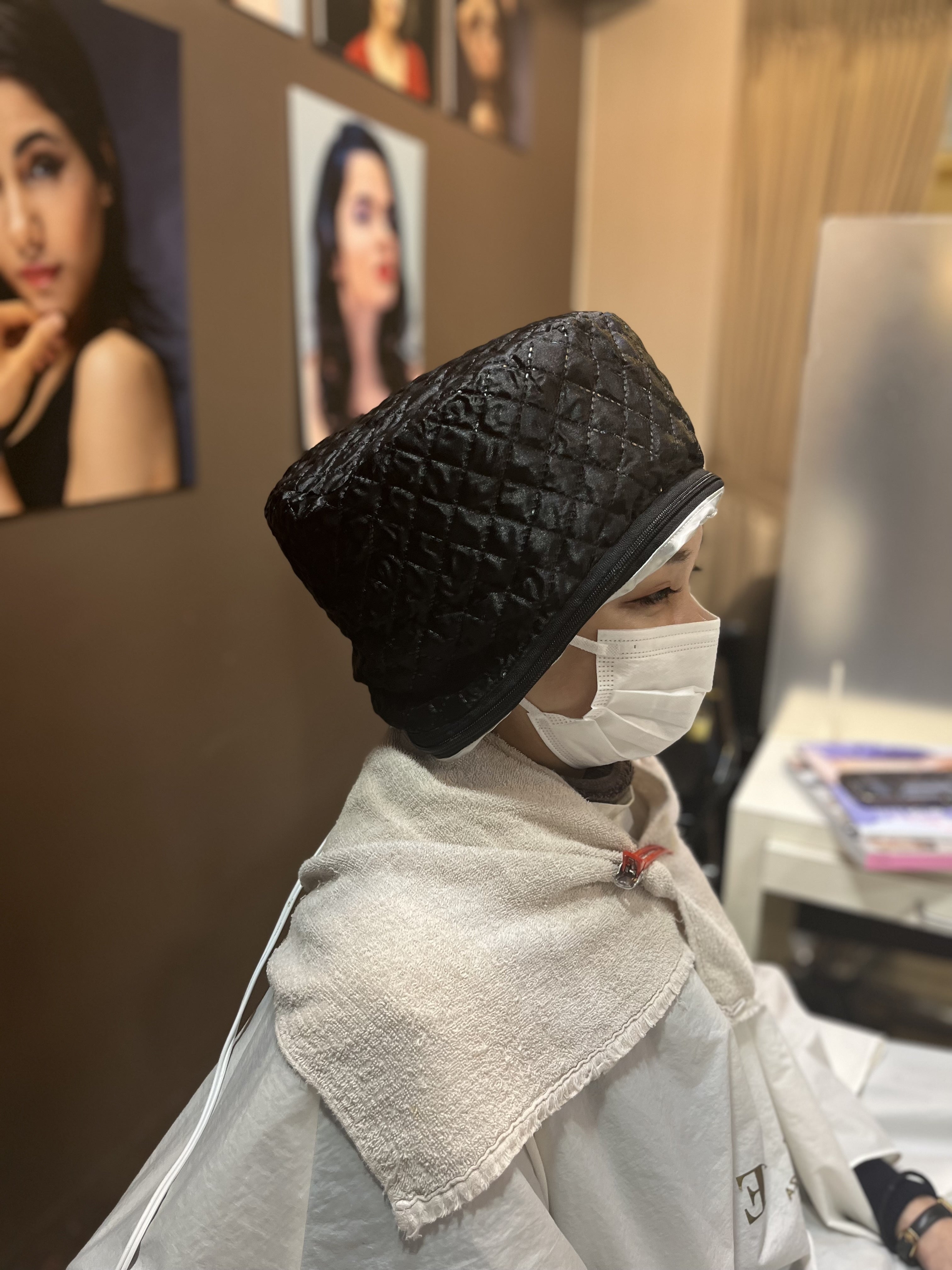 トリートメントの効果を最大限に引き出すため、加熱キャップを使用して髪に熱を加えます。これにより、トリートメント成分が髪の内部までしっかりと浸透します。