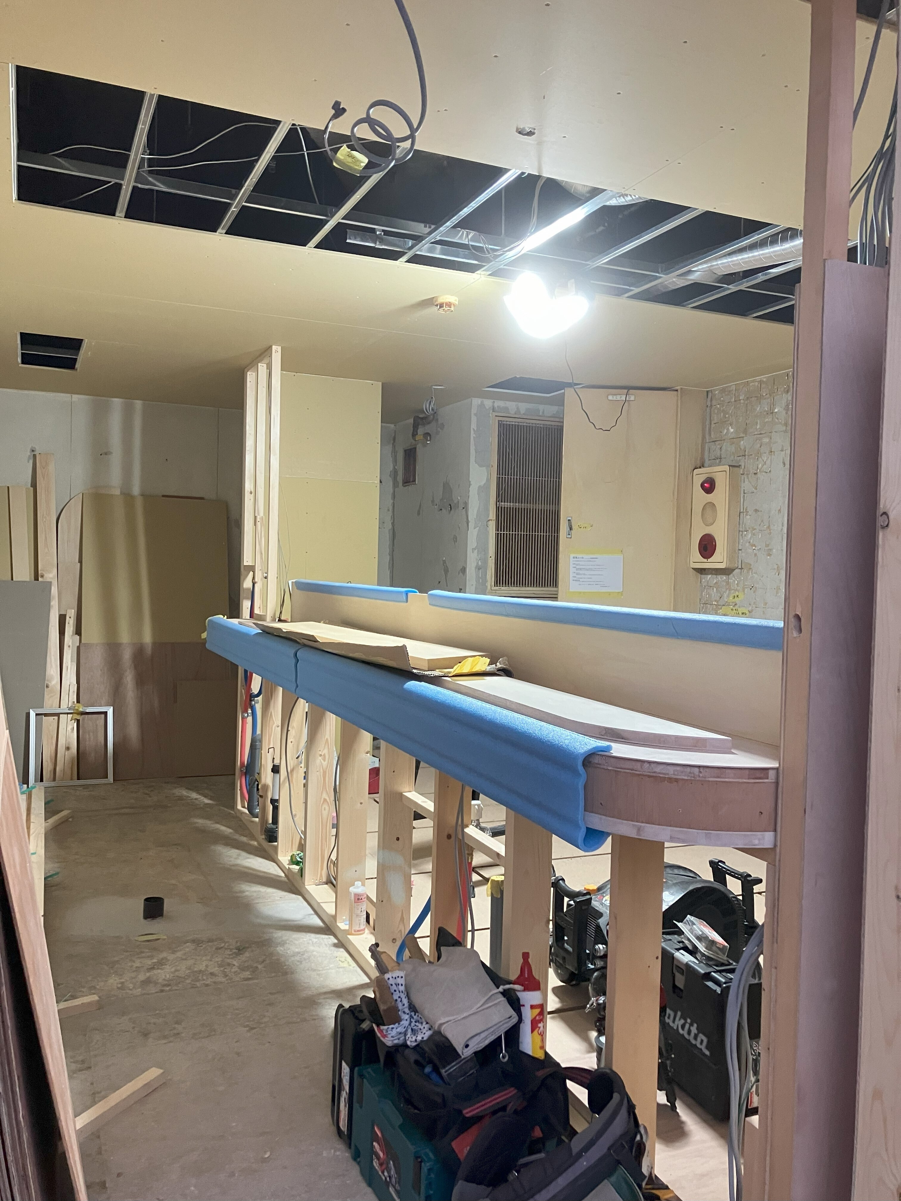 工事も着々と進んでおります。昨日は腰壁の色の最終確認をしました。