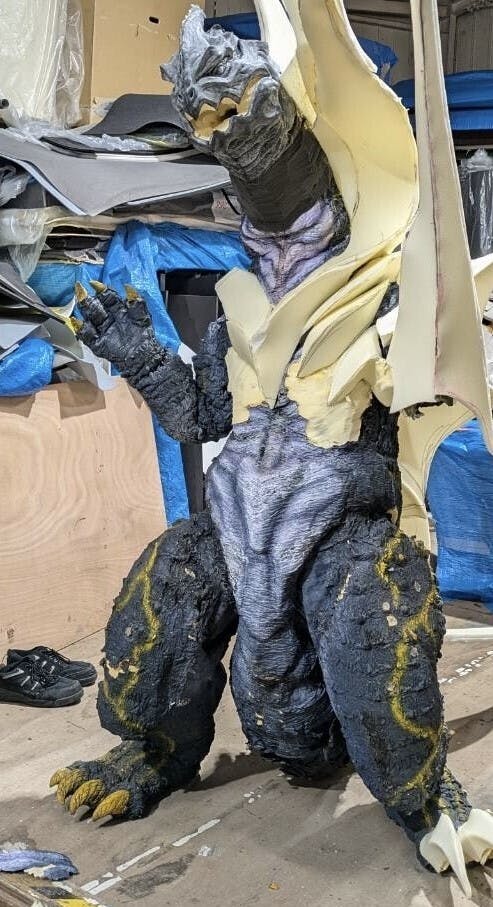 活動報告 前夜支援してくださった皆様 今回は、本当にありがとうございました。活動報告 新怪獣グラ―ディオ(仮)について『特撮喜劇 大木勇造 人生最大の決戦』の怪獣ヴァイラスキングが、撮影、数年後の劇場の挨拶など、経年劣化で、皮膚のウレタンなどが相当傷んでしまいました。昔、聞いた怪獣の流用 バラゴン→ウルトラQのパゴス→ウルトラマンのネロンガ→ガボラのように、ヴァイラスキングもボディを使い新怪獣へと甦らせたいと思いました。そして、デザインのマツモトさんに怪獣のデザインをいくつか描いて貰い、その中から現在の怪獣グラ―ディオ(仮)のデザインを選び、ヴァイラスキングからの作り替えをしていきました。ヴァイラスキングと今回のグラ―ディオ(仮)見た目ではわからないと思いますが、実は同じボディなんです。ヴァイラスキングが基になったと分かる造形途中の写真です(上)完全な脚本が出来る前に、怪獣を作る段取りをしていました。少しづつですが、支援者様 限定で、書いていきますので、写真だけは外に出さないで下さい引き続き、完成まで頑張りますので、宜しくお願いします。石井良和