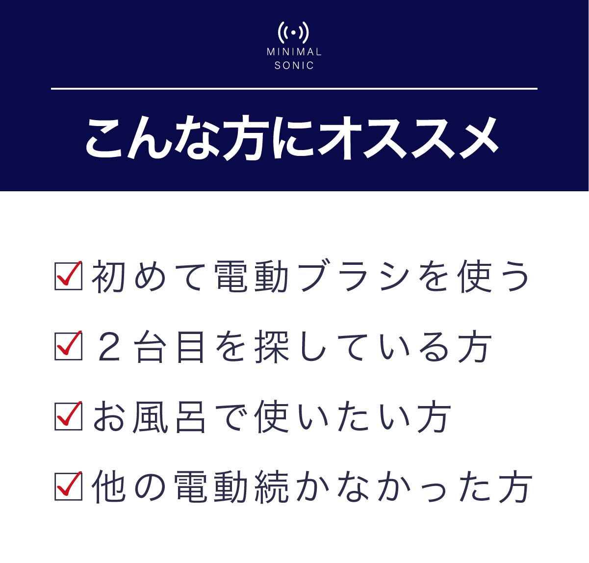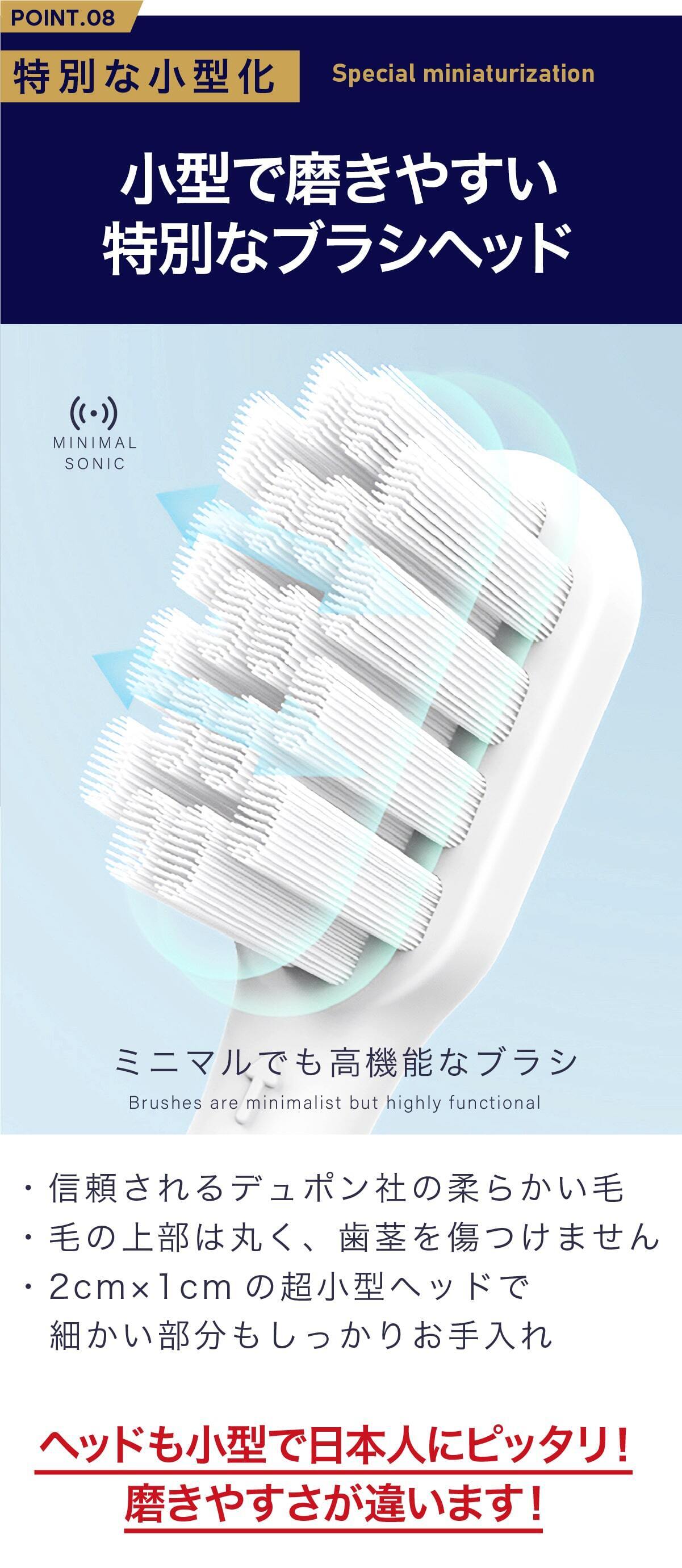 今までの電動歯ブラシを大きいと感じたことはありませんか?普通の歯ブラシから電動歯ブラシに変えた時にそれを大きく感じると思います。電動歯ブラシは構造上、大型化してしまうのですが、常識に囚われずまったく新しい電動歯ブラシを設計したのがこのミニマルソニックです。新発想の構造で小型でパワフル。未来の体験をはじめましょう。
