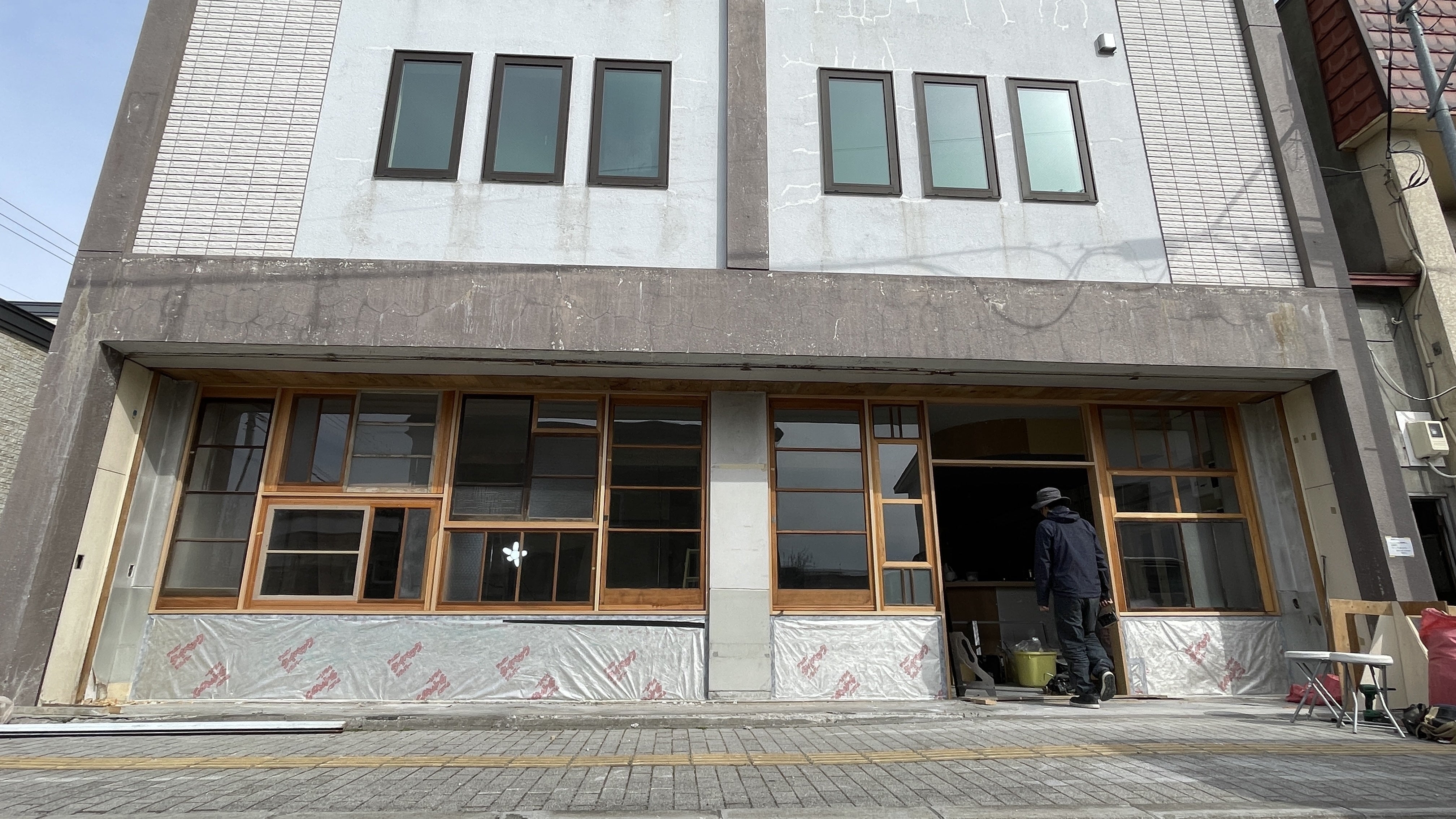 中村さんから「工事手伝ってくれない?」と声をかけていただき、リビセンがデザインした窓のパッチワークをはめこむ、店舗の顔となるファサード施工作業に携わりました。
