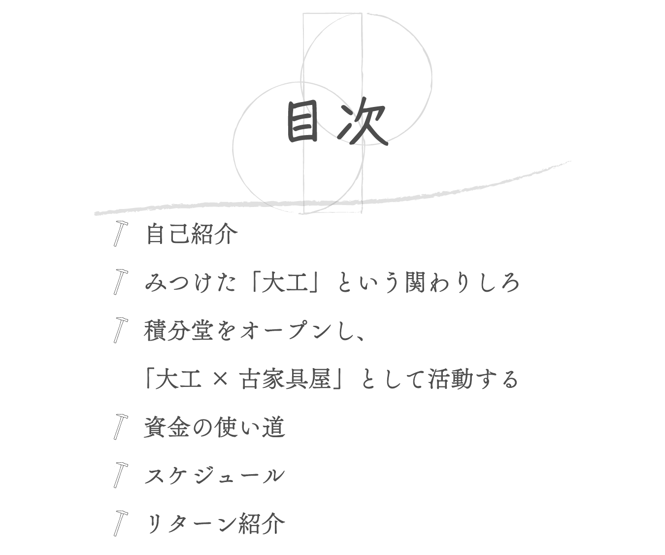 自身が大工となり、レスキューした古家具などを販売することで、空き家の流通や新規開業をサポートすることに関わっていきたいと考えています。