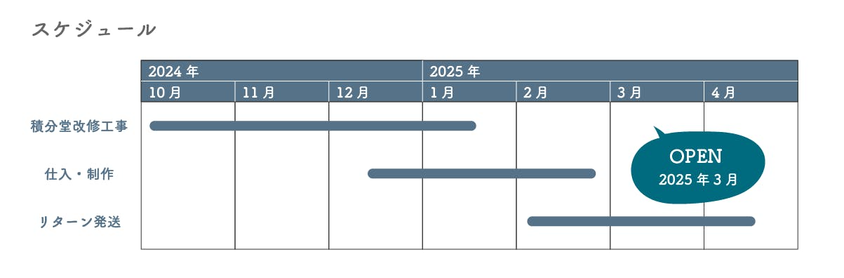 2025/04/21 22:04いよいよ積分堂のオープン日が決定しました。2025年5月3日(土)に開店いたします。現在も絶賛工事中にて、オープン直前におおよその仕上げまでできるか否かといったところであり、レスキューした古家具の修繕やリメイクなども全然できていないのですが、積分堂という場所を一旦お披露目しようと思っています。これから少しずつ、お品物や古家具を増やせていく予定です。ご支援いただきました皆様や、改装、諸々のお手伝いをしてくれました友人知人のおかげで、積分堂という場所はできました。感謝の気持ちでいっぱいです、改めて、本当にありがとうございました。リターンの送付や、諸連絡が遅れてしまっており、大変ご迷惑おかけしていること、お詫びもおうし上げます。店舗も完成するので、急いで制作、お届けさせていただきますので、引き続き何卒よろしくお願い申し上げます。5月はGWの4日間のみの営業となりますが、もしお時間ある方はぜひ足を運んでいただけたら幸いです。一緒に、積分堂のハレの日をお祝いしていただけたら嬉しいです。このたび、古家具と古材を中心とした店舗「積分堂(せきぶんどう)」を、2025年5月3日(土)に開店いたします。...長き冬を越え、幾度となく息を整えながら、ようやくこの日を迎えられる運びとなりました。お待たせしてしまいましたこと、深くお詫び申し上げます。それでもなお、変わらぬ眼差しとお力添えを賜りましたことに、感謝の念は尽きることがございません。多くの皆さまのあたたかな応援、ご支援が、灯火のように心を照らしてくれました。暮らしの只中に、そっと寄り添う場所でありたいと願っております。�晴れの佳き日を、皆様と共に分かち合えましたなら、冥利に尽きます。春のはじまりに、感謝とともに、静かに扉を開けてお待ちしております。積分堂 店主 タサキ アツヤ...5月は下記の4日間のみ、営業を行います。■ 5月の営業日程・5月3日(土)|11:00〜18:00・5月4日(日)|13:00〜18:00・5月5日(月)|13:00〜18:00・5月6日(火)|13:00〜18:00※6月以降は、基本は月に一度、いずれかの一週間を営業期間として予定しております。※営業時間は13:00〜18:00を基本とし、変更がある場合は随時ご案内いたします。※状況に応じて、臨時営業を行う場合もございます。※営業時間は随時お知らせいたします。.なお、5月の営業は、本格的な販売開始に先立ち、店舗としての最初のお披露目という形での実施となります。古家具・古材は主に展示のみ、雑貨類もごく一部のみの取り扱いとなります。現時点でご用意できる範囲での営業開始となる旨、あらかじめご了承いただけますと幸いです。今後は、取り扱い商品を段階的に拡充してまいります。ご都合のよろしい際に、ぜひお立ち寄りくださいませ。 もっと見る