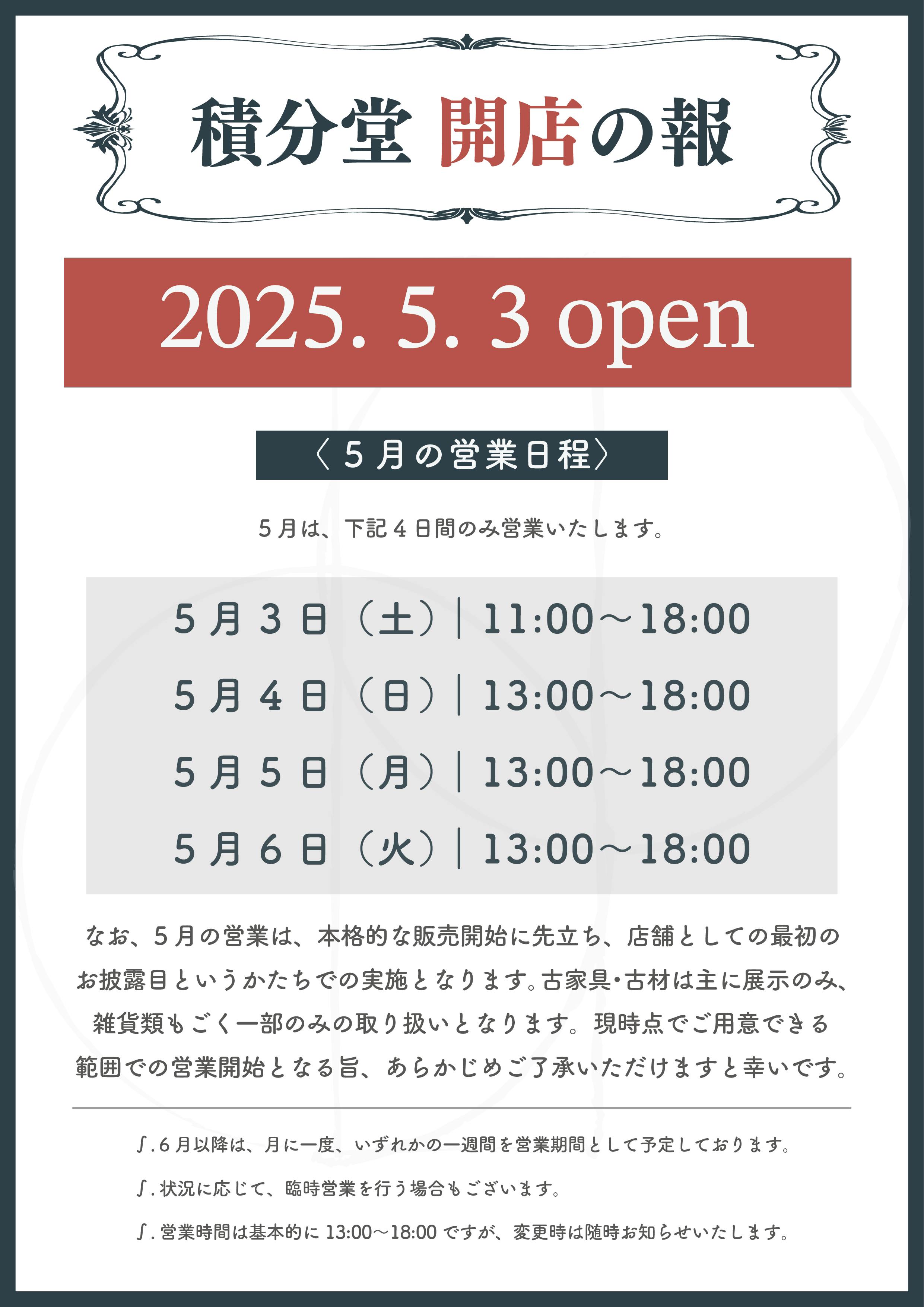 このたび、古家具と古材を中心とした店舗「積分堂(せきぶんどう)」を、2025年5月3日(土)に開店いたします。