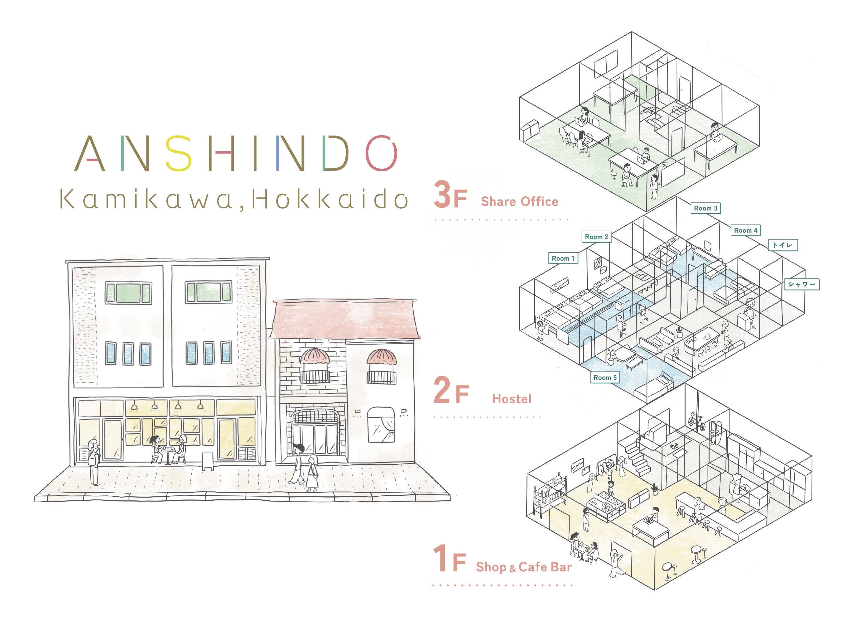 ANSHINDOプロジェクトは、友人たちの会社である「EFC」とその仲間たちが、上川町の中心市街地にある長年空き家となっていた元薬局兼住居の3階建のビルをリノベーションし、泊まれる複合施設をつくるプロジェクトです。