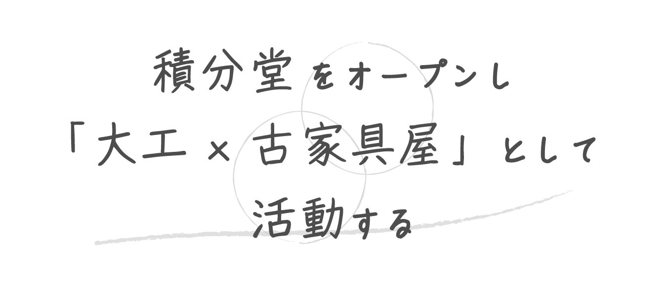 現在は自身の肩書きを「大工」とし、リノベーションや内装の仕上げ、オーダーメイド家具の制作などを行っております。そしてその集大成として、店舗兼アトリエである「積分堂」をつくっています。