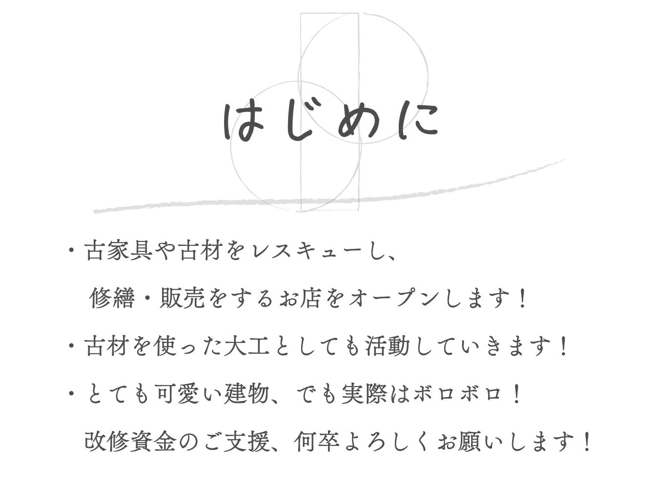 2025/04/21 22:04いよいよ積分堂のオープン日が決定しました。2025年5月3日(土)に開店いたします。現在も絶賛工事中にて、オープン直前におおよその仕上げまでできるか否かといったところであり、レスキューした古家具の修繕やリメイクなども全然できていないのですが、積分堂という場所を一旦お披露目しようと思っています。これから少しずつ、お品物や古家具を増やせていく予定です。ご支援いただきました皆様や、改装、諸々のお手伝いをしてくれました友人知人のおかげで、積分堂という場所はできました。感謝の気持ちでいっぱいです、改めて、本当にありがとうございました。リターンの送付や、諸連絡が遅れてしまっており、大変ご迷惑おかけしていること、お詫びもおうし上げます。店舗も完成するので、急いで制作、お届けさせていただきますので、引き続き何卒よろしくお願い申し上げます。5月はGWの4日間のみの営業となりますが、もしお時間ある方はぜひ足を運んでいただけたら幸いです。一緒に、積分堂のハレの日をお祝いしていただけたら嬉しいです。このたび、古家具と古材を中心とした店舗「積分堂(せきぶんどう)」を、2025年5月3日(土)に開店いたします。...長き冬を越え、幾度となく息を整えながら、ようやくこの日を迎えられる運びとなりました。お待たせしてしまいましたこと、深くお詫び申し上げます。それでもなお、変わらぬ眼差しとお力添えを賜りましたことに、感謝の念は尽きることがございません。多くの皆さまのあたたかな応援、ご支援が、灯火のように心を照らしてくれました。暮らしの只中に、そっと寄り添う場所でありたいと願っております。�晴れの佳き日を、皆様と共に分かち合えましたなら、冥利に尽きます。春のはじまりに、感謝とともに、静かに扉を開けてお待ちしております。積分堂 店主 タサキ アツヤ...5月は下記の4日間のみ、営業を行います。■ 5月の営業日程・5月3日(土)|11:00〜18:00・5月4日(日)|13:00〜18:00・5月5日(月)|13:00〜18:00・5月6日(火)|13:00〜18:00※6月以降は、基本は月に一度、いずれかの一週間を営業期間として予定しております。※営業時間は13:00〜18:00を基本とし、変更がある場合は随時ご案内いたします。※状況に応じて、臨時営業を行う場合もございます。※営業時間は随時お知らせいたします。.なお、5月の営業は、本格的な販売開始に先立ち、店舗としての最初のお披露目という形での実施となります。古家具・古材は主に展示のみ、雑貨類もごく一部のみの取り扱いとなります。現時点でご用意できる範囲での営業開始となる旨、あらかじめご了承いただけますと幸いです。今後は、取り扱い商品を段階的に拡充してまいります。ご都合のよろしい際に、ぜひお立ち寄りくださいませ。 もっと見る