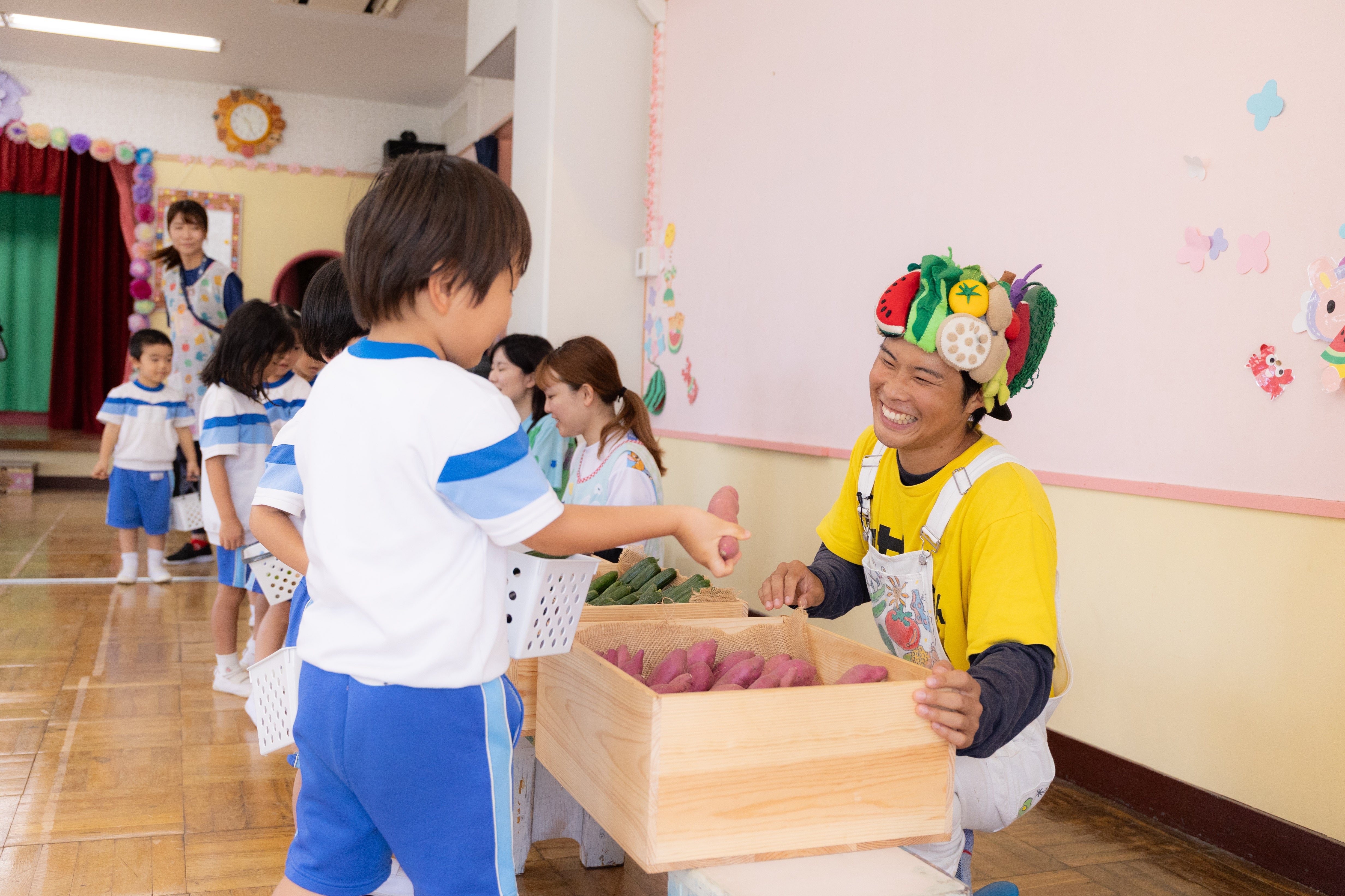 八百屋さん:数種類の野菜を人数分持っていき実際に野菜を見たり触れたり、おいしい野菜の選び方をヤサイちゃんと一緒に学びます。季節に合わせた旬の野菜を持っていくことで野菜の旬を知ることや選び方を子供が親にも教えてあげられるようになることを目指しています。