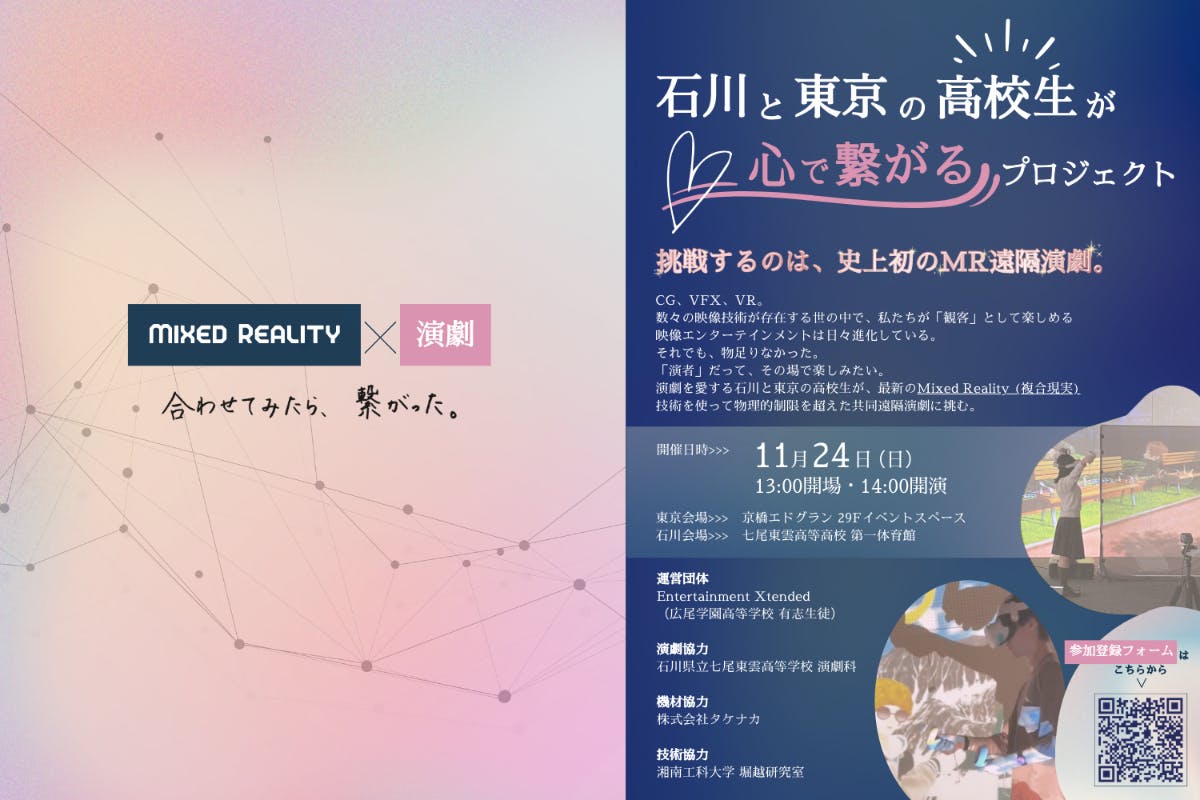 演劇を愛する石川県の高校生と東京都の高校生が、物理的制限を超えて共同遠隔演劇を完成させます。最新テクノロジーMR技術(Mixed Reality:複合現実)を活用し二つの離れた地域の高校生がまるで一緒に劇をしているように創り、完成した作品を被災地で無料公演します。MR技術を観客に導入することは過去にありましたが、演者に導入することはほとんどありませんでした。そうした面では、我々の「演者も観客も」遠隔で繋がれる演劇は史上初の試みと言えるでしょう。誰も実現したことのないMR演劇、MRシアターモデルです。エンタメテック界、演劇界に変革をもたらすスタートを目指します。また、生配信または後日動画での視聴も可能にすることも視野に入れていて、石川県以外の地域の方にもお楽しみいただけるように予定しております。