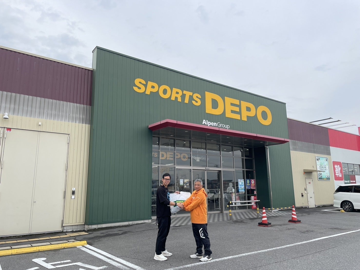 写真は、本日(11月15日)スポーツDEPO守山志段味店の店頭にて、徳永店長さんから能登半島地震復興支援のプロジェクトのイベントで使用させていただくアルペンの横断幕とスポーツDEPOの横断幕を受け取りました。