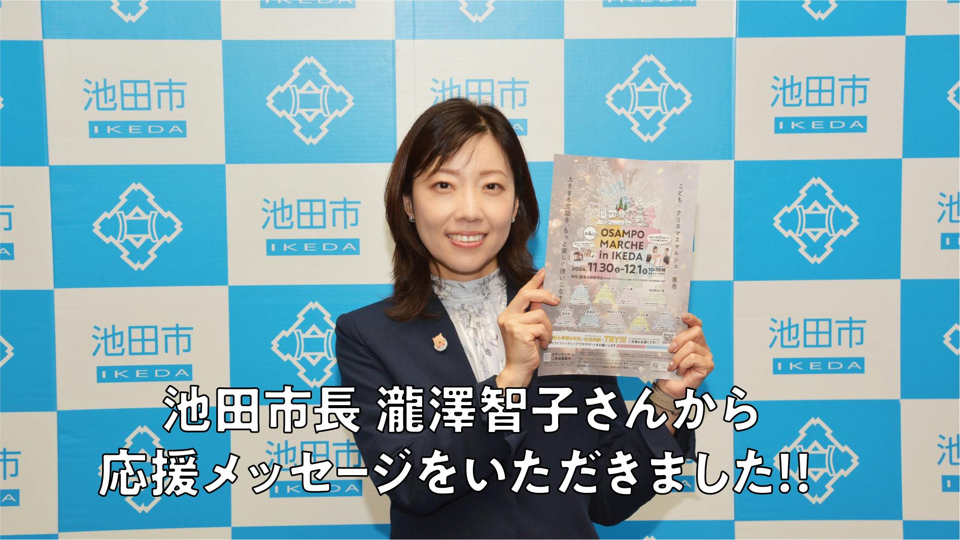 本日は、いけだエリアプラットフォーム、ならびに、おさんぽマルシェ in IKEDAを応援いただいている、池田市長の瀧澤 智子さんからの応援メッセージをご紹介いたします。