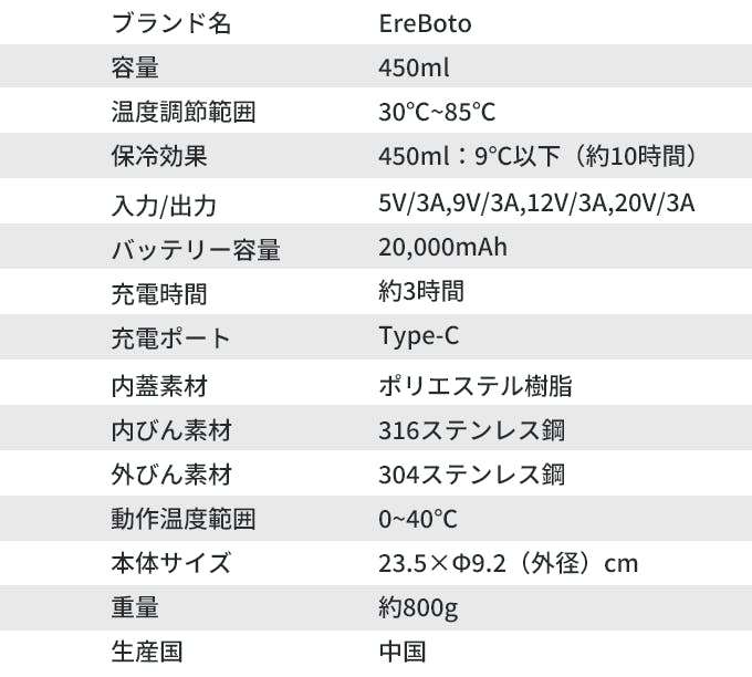 「EreBoto」は、30℃から85℃までの12段階の温度調節が可能で、コーヒー、紅茶、緑茶など、さまざまな飲み物を最適な温度で楽しむことができます。