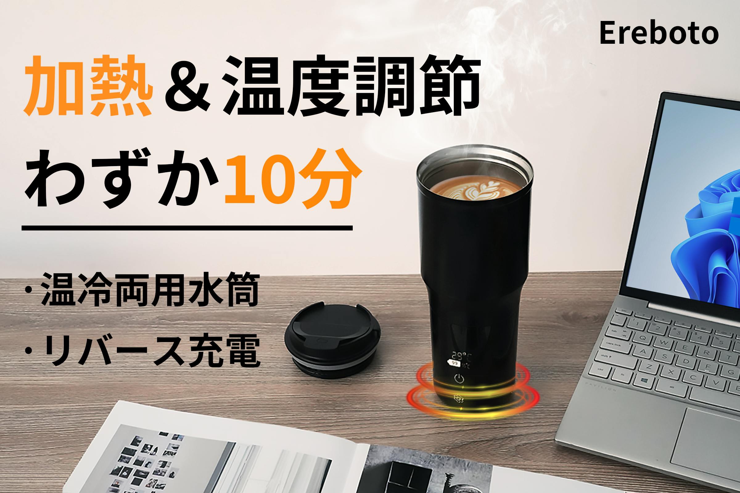 「EreBoto」はインテリジェント温度管理システムを搭載しており、ボトル内の飲み物を正確に温度検知し、素早く加熱できます。わずか約10分で冷たい飲み物を心地よい温かさ(60℃)に変えることが可能です