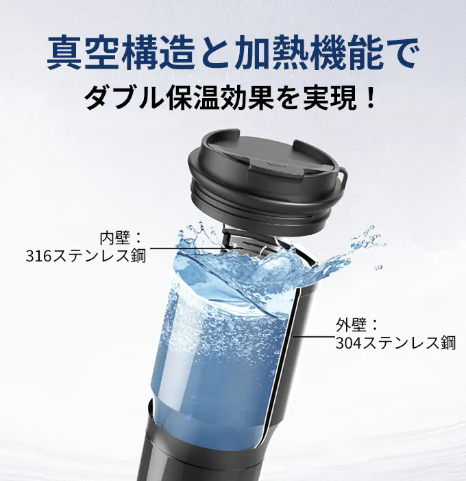 本体の内側と外側が二層構造になっており、外壁と内壁の間に真空断熱層が形成されています。この真空構造により、優れた保温・保冷効果を実現し、飲み物の温度を長時間保ちます。