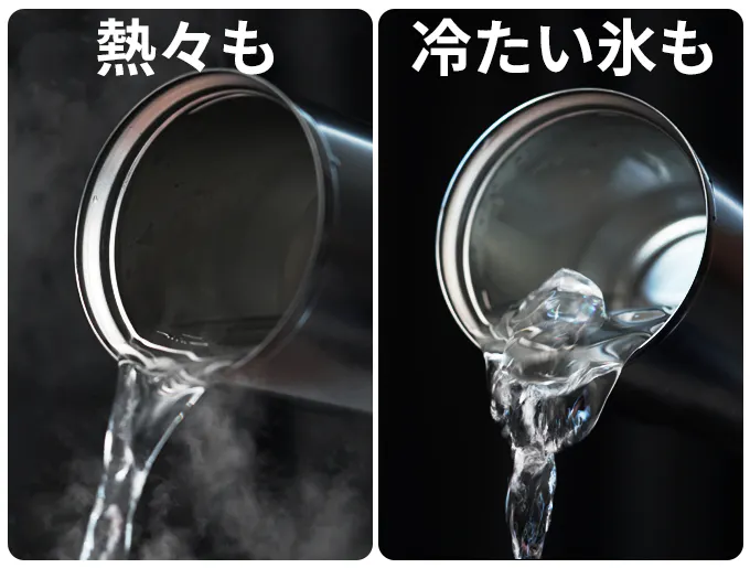 真空断熱構造と高い密閉性により外気の影響を受けにくく、一年中理想的な温度で楽しむことができます。冬は24時間温かさを保ち、夏は3時間程度氷が溶けにくく、冷たさが続きます。