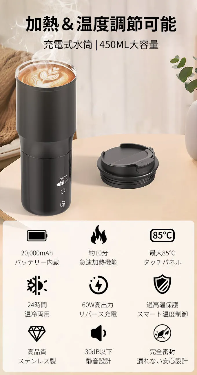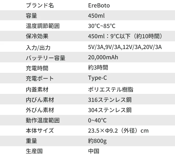 「EreBoto」は20,000mAhの大容量リチウム電池を搭載し、電源不要で飲み物を手軽に加熱できるポータブルボトルです。24時間にわたって飲み物を理想の温度に保ちます。冷たい外気にさらされる冬でも、常に温かい飲み物を楽しめます。