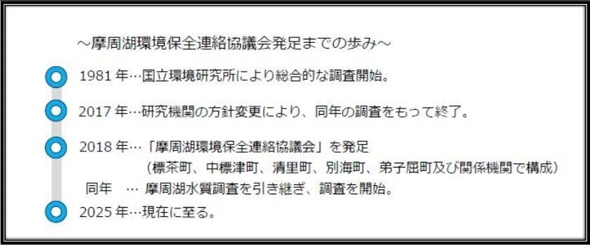 しかし、この美しい摩周湖を後世に守り残すため、摩周湖周辺の5町(清里町・別海町・中標津町・標茶町・弟子屈町)および関係機関において、2018年に「摩周湖環境保全連絡協議会」を発足し、摩周湖の水質調査を引き継ぐほか、摩周湖の環境保全のための普及啓発活動を行っております。
