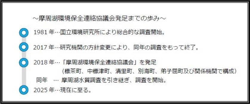 しかし、この美しい摩周湖を後世に守り残すため、摩周湖周辺の5町(清里町・別海町・中標津町・標茶町・弟子屈町)および関係機関において、2018年に「摩周湖環境保全連絡協議会」を発足し、摩周湖の水質調査を引き継ぐほか、摩周湖の環境保全のための普及啓発活動を行っております。