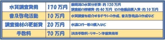 同協議会は摩周湖の水質調査のほか、環境保全の普及啓発活動、クラウドファンディングなどを実施しておりますが、年間に掛かる費用は下記の内訳からなっております。