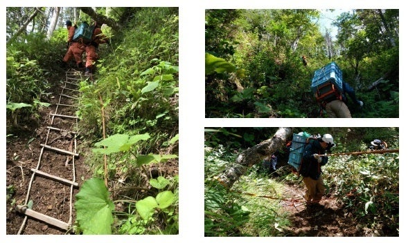 調査を行うにあたり、摩周湖は約200mもの高低差のある急斜面や非常に滑りやすい道や岩場など厳しい環境です。調査時には人の手で調査船の燃料や水質調査機材などの重たい荷物を持ち運び、ロープやハシゴを頼りに湖岸に降りていきます。
