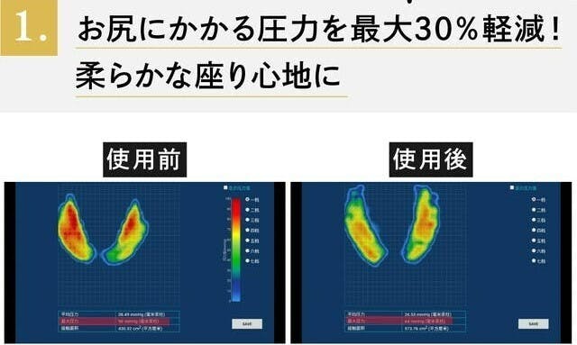 お尻にかかる最大圧力を96mmHgから64mmHgに圧力分散軽減し、お尻にかかる負担を大幅に軽減します。本当に素晴らしい商品ができたと自負しておりますので、是非ご支援のほどよろしくお願いいたします。