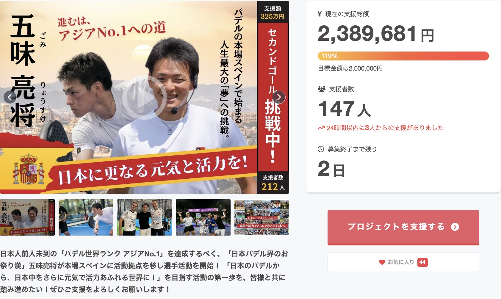 セカンドゴールで掲げた”仲間(=支援者数)212名”へ向かい、残り許された活動期間も全力打球で頑張ります!!