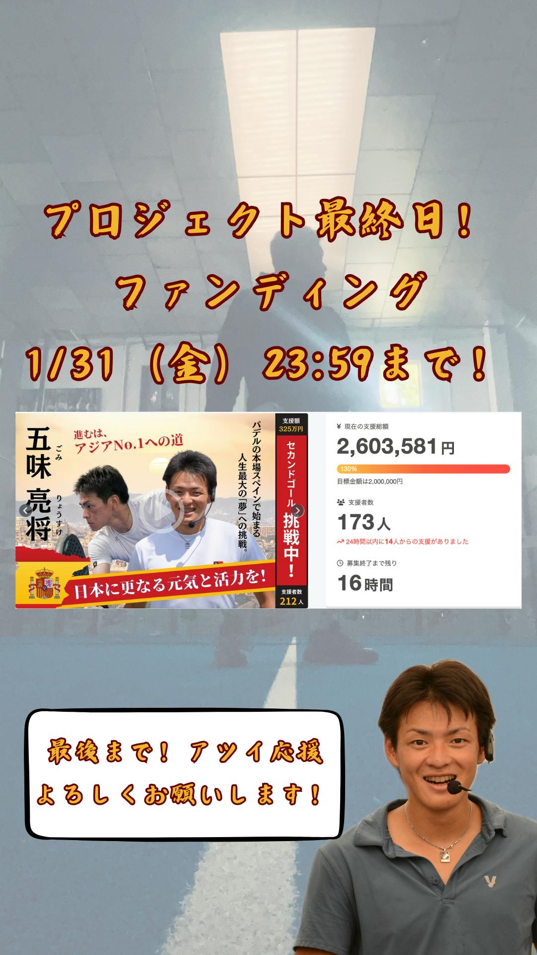 Hola!ごみちゃんです!2024年12月6日から始まり、”「日本のパデルから、日本中をさらに元気で活力あふれる世界に!」”共にこの”大きな夢”へ進んでくださる”仲間”と”エネルギー”を募らせていただいた、そんなクラウドファンディングプロジェクトも、ついに残すところ”15時間”。構想数ヶ月、ファンディング期間合計57日。今日、最終日を迎えました!日本時間7:00現在、173人の”仲間”な皆さんから、支援総額260万円を超えるエネルギーを頂戴しています!!”頑張ってるね、応援しているよ!””挑戦、楽しんでね!!””どんな時も前向いてファイト!!”仲間に加わってくださった皆さんからの、沢山の温かい応援の言葉、励ましの言葉。月並みな言葉に落ち着いてしまうのがイヤと思うほど、自分はつくづく恵まれています。パデルを始めた頃には、誰がこんな未来を想像していたか・・・。_______新しいことができるようになる”嬉しさ”・・・!新しいコミュニケーションの輪が広がる”楽しさ”・・・!当時22歳だった”新社会人のごみちゃん”は、こんな魅力に惹かれて、パデル沼に飛び込んでしまいました。そして今はというと。。そんなパデル沼の中で、いろんな経験をさせてもらい、本気で叶えたい夢ひとつ抱いて。サラリーマンを辞め、デュアルキャリアの道から突如離れ本場スペインに飛び出した、、”やっぱり”ただパデルが大好きで、極めたくて、そんでもって元気が取り柄で、”みんなが笑顔になること”がただ大好きな、そんなアラサー男子です。僕自身も自分がどうだかを認識してるし、周りで見守ってくださる皆さんは気づいていると思いますが、ナイーブなところもあるし、無理して突っ走るところもある。そんな僕を、そしてこのプロジェクトを、沢山の方が沢山の方向から背中を押してくれて、時には肩叩いて止めてくれて、一緒に進むよ!と沢山のパワーが集まって、、ついに大きな夢への”スタートライン”が目の前に引かれようとしています。このスタートラインを超えるその一歩は、”仲間”と一緒に”日本のパデルが更に元気と活力を与える存在になる世界”を目指す長い旅の第一歩!そして、このプロジェクトに集ってくれた”仲間”と”一丸となって日本パデル盛り上がりの起爆剤”になる、新たな始まりの日を迎える!ラスト1日、ぜひこの記事を・プロジェクトをご覧いただいている皆さん!このプロジェクトでは最後のお誘いです!ぜひ、”大きな夢”へのスタートラインを共に越える”仲間”になってください!”日本のパデルへ、日本へ更に元気と活力を!"の波をさらに大きくするために!そしてその道すがら、”元気の火”が灯る人を1人でも増やすために・・・!!一緒に!ぜひ一緒にスタートラインを越えて、元気いっぱいで”大きな夢”へ進んでいきましょう!Vamooooooos!