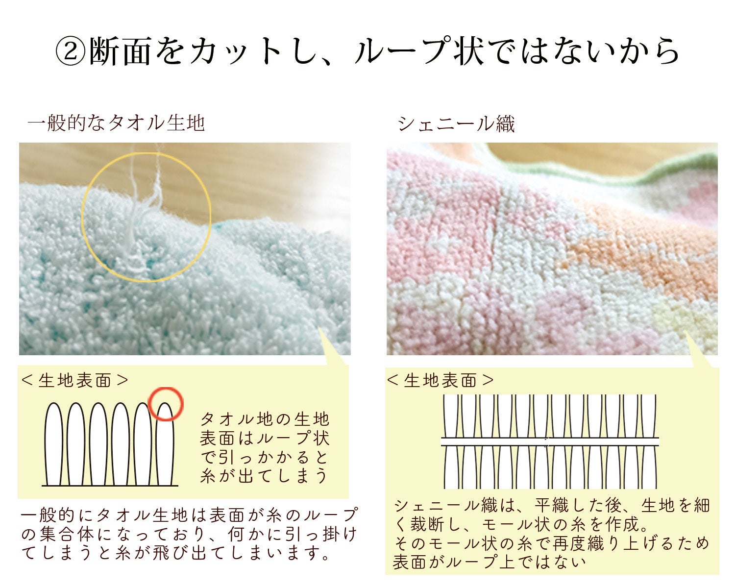 ループ状のパイルの断面をカットすることで、引っ掛かりがなくなります。