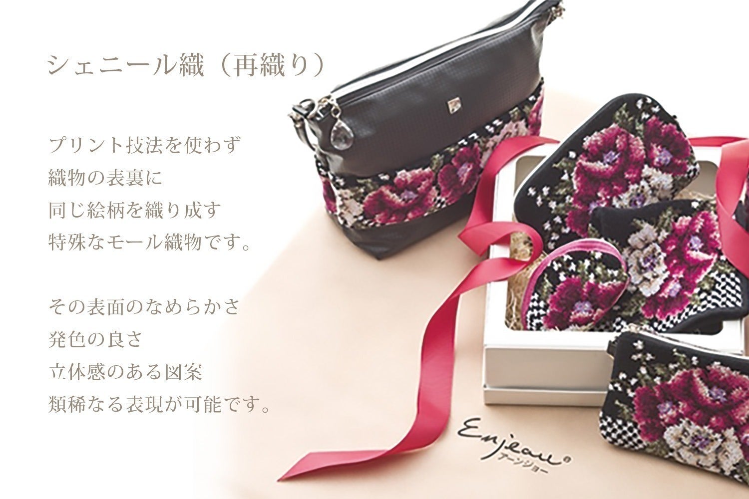 弊社は「アーンジョー」ブランドでシェニール織のハンカチや小物バッグなど「レアフィール」ブランドでオーガニックコットンを原料としたハンカチリネンのハンカチなどを自社で開発・製造・販売しております。商品は全国主要百貨店やインターネットショップ、一部ペットショップでお取り扱い中です。