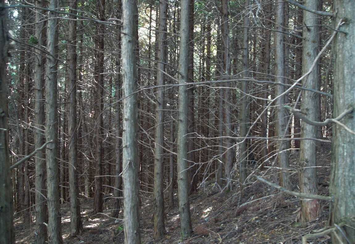 間伐や枝打ちなどの手入れがされない林内は暗く、林床に下草も生えません。木一本一本も細く、根は大きく張れていません。林内は生物の多様性が低く、大型野生動物の食糧はありません。