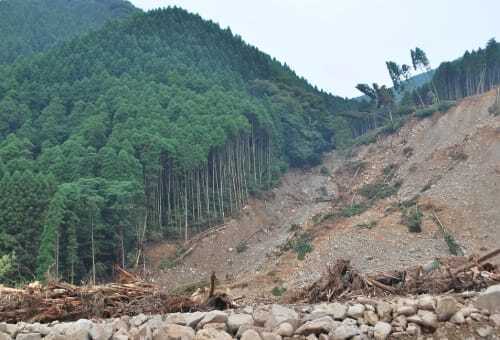 荒廃した人工林は崩れやすく、山崩れや土石流が各地で発生しています。近年の大雨や台風の増加で、さらにその危険性が増しています。