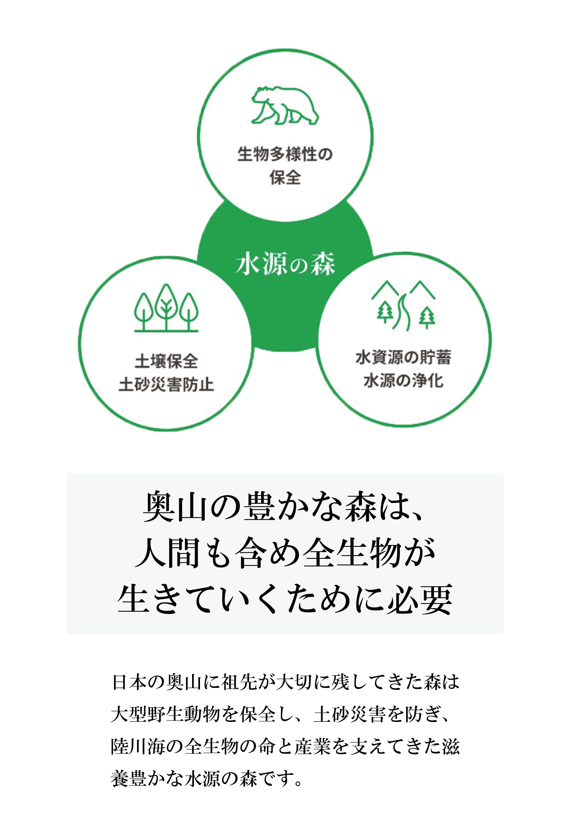 クマたちが棲む森は保水力抜群で、生物の多様性が保たれた最高に豊かな森です。日本の奥山にわずかに残ったクマの棲む水源の森を保全します。