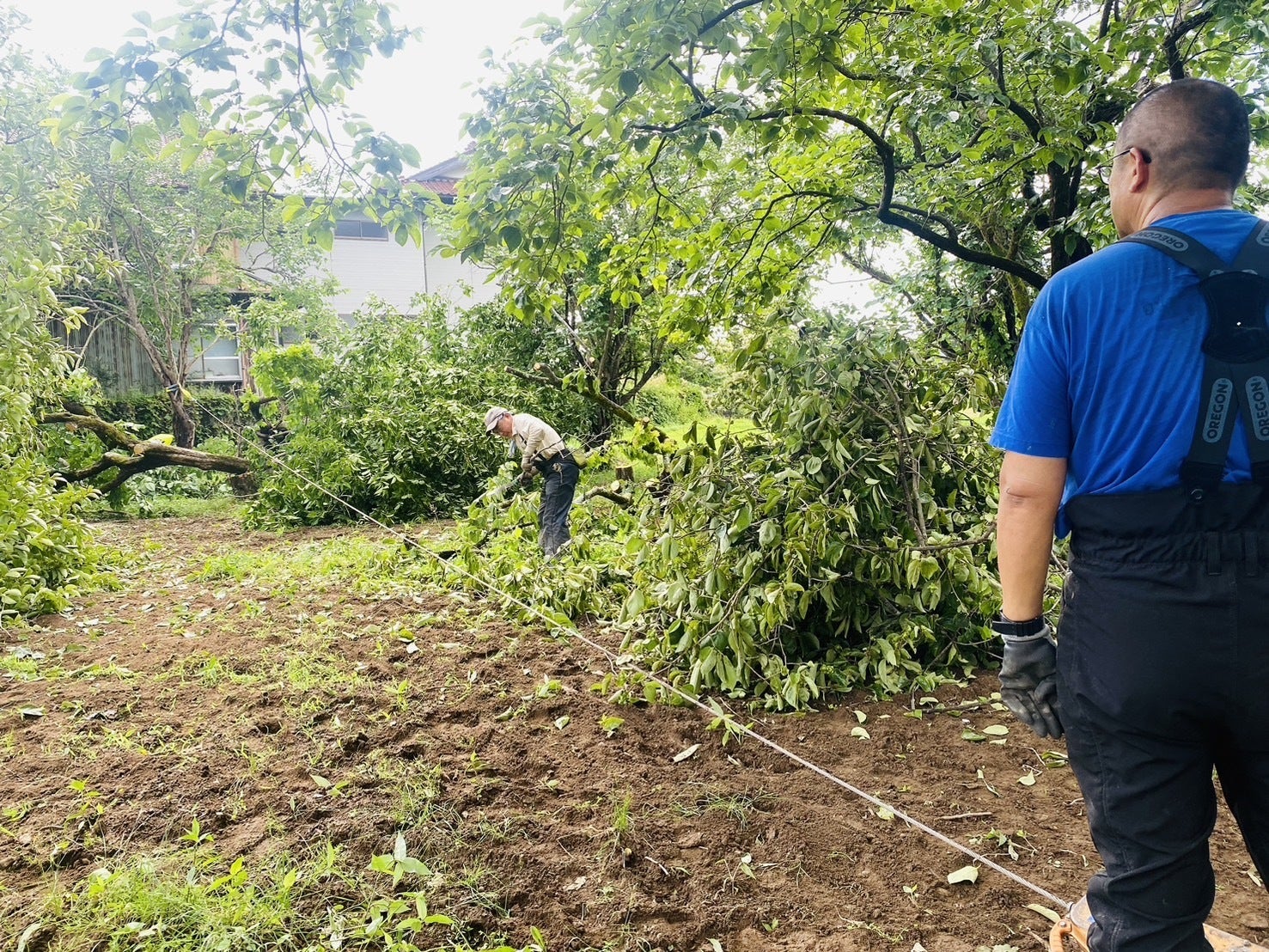 作業現場到着。クマが集落の中にまで入ってこないよう、ち密に計画した伐採本数は41本。複数回に分けて作業します。その中で、広い土地にある複数の柿の木はスピード感を持って、人家近くにある柿の木は家屋に当たって破損しないよう慎重に。場所によって対応を変えて伐採していきます。