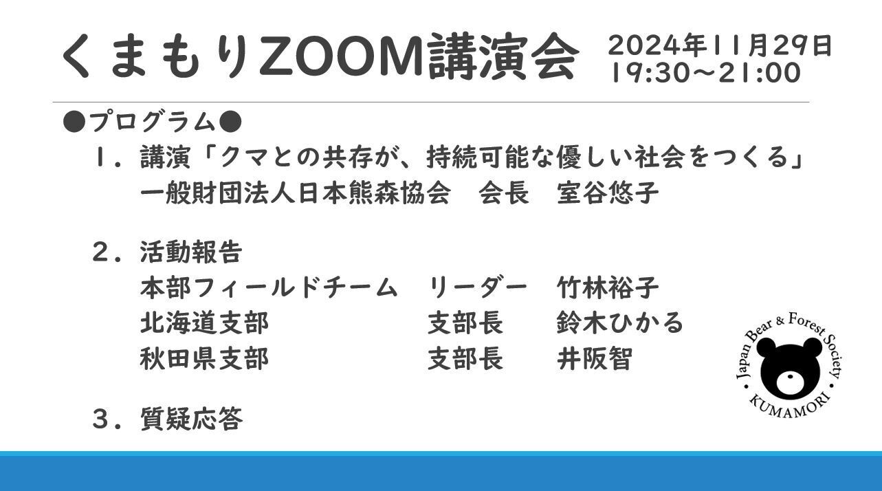 11月29日、「クマとの共存が、持続可能な優しい社会をつくる」と題して、ZOOM講演会を開催しました。短い期間でのお知らせでしたが、参加者は最大221名!たくさんの方にご参加いただきました。ありがとうございました!