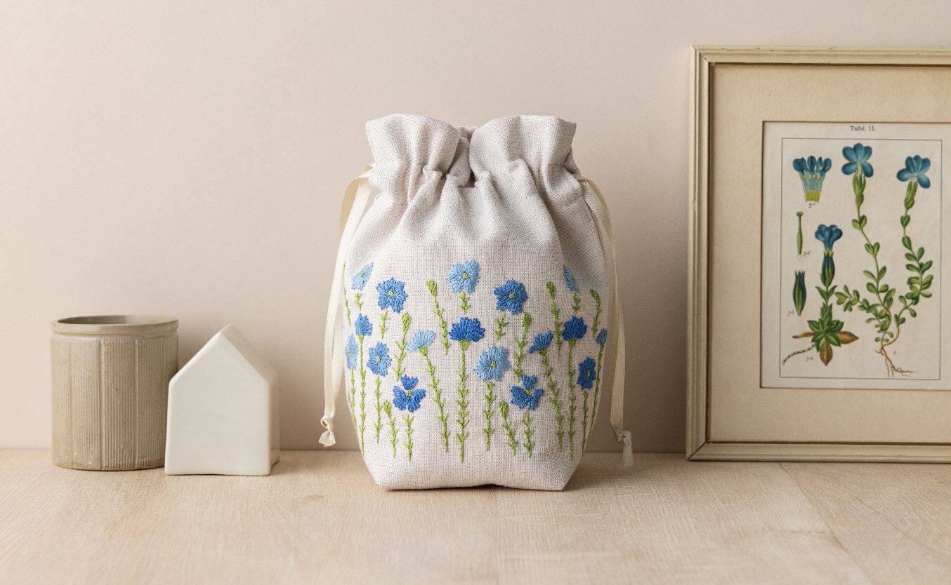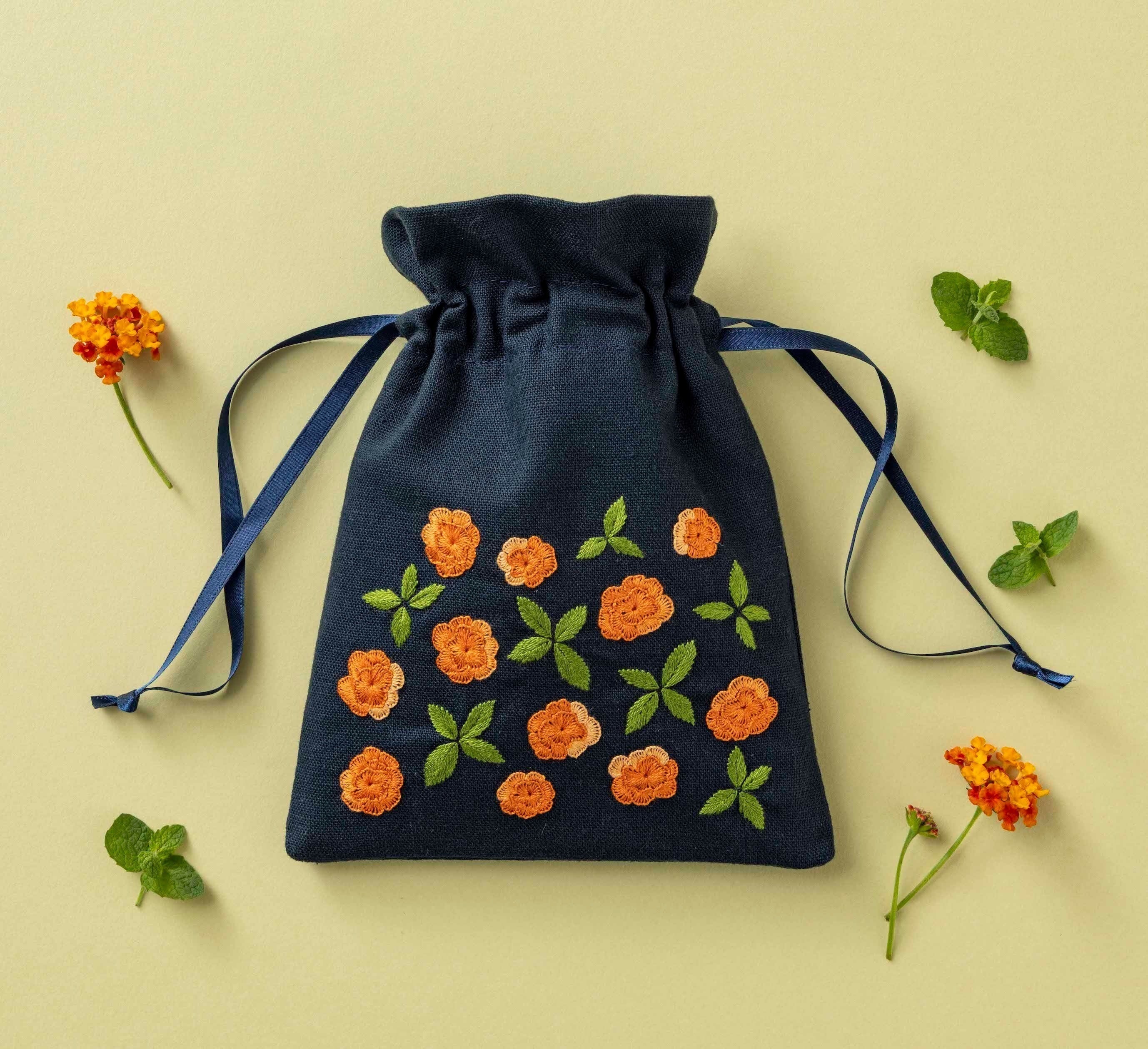 ※巾着袋【クロッサンドラ】(サイズ:タテ18㎝×ヨコ14㎝)が作れる材料がセットになっているので、届いたらすぐに刺繍が楽しめます。