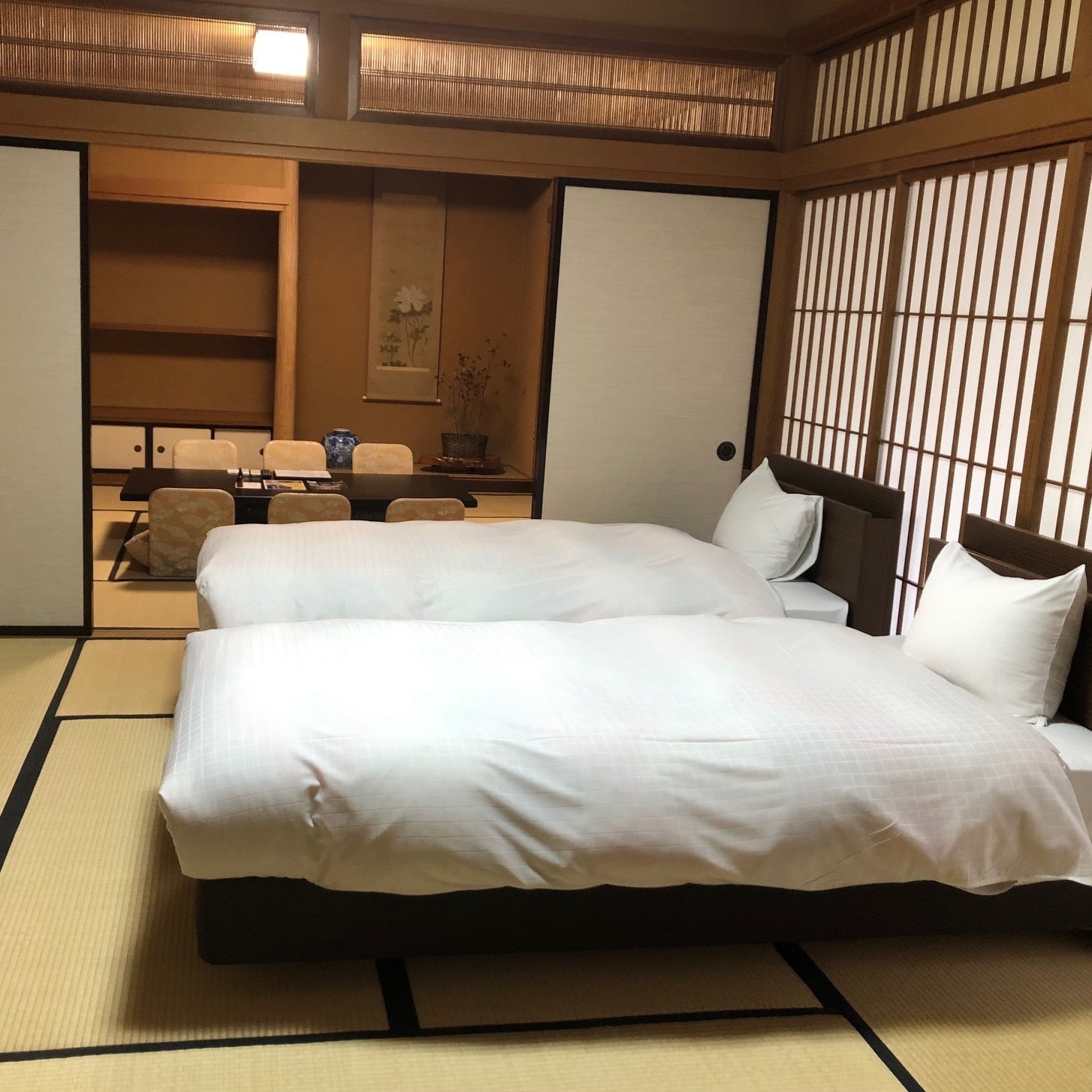 ご希望があれば布団を奥のお部屋に2枚敷き、真ん中を襖でしきる使い方も出来ます。