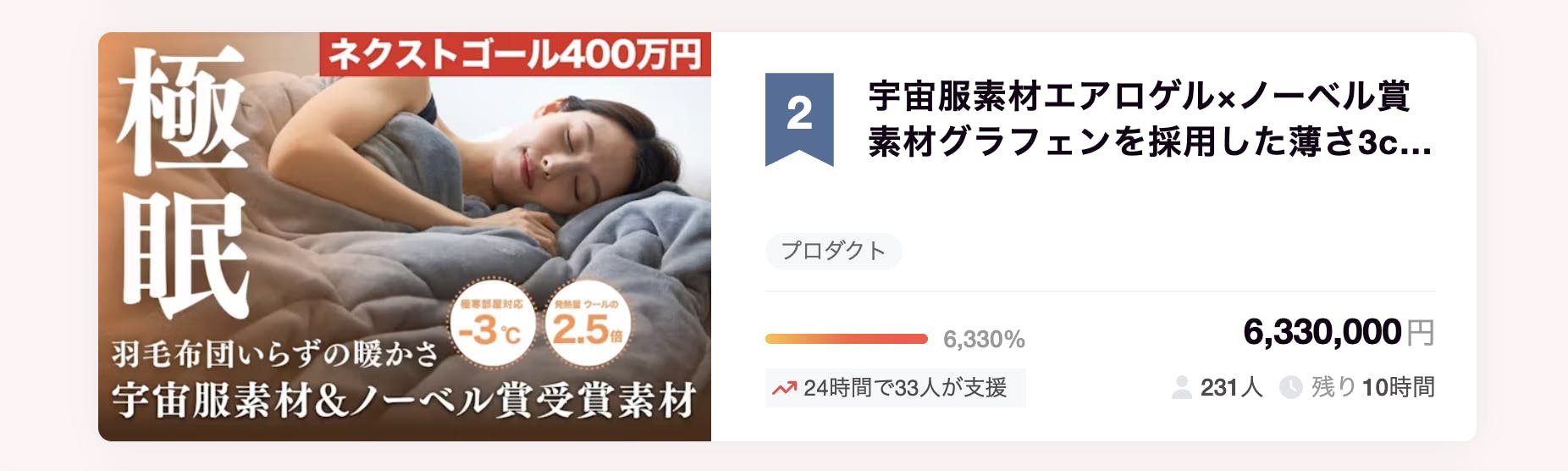 この度は宇宙服素材エアロゲル×ノーベル賞素材グラフェンを採用した薄さ3cmの極暖掛け布団に多大なるご支援をいただき、誠にありがとうございます。皆様のお力添えのおかげで、支援金額600万円を超えるご支援を達成することができました!!