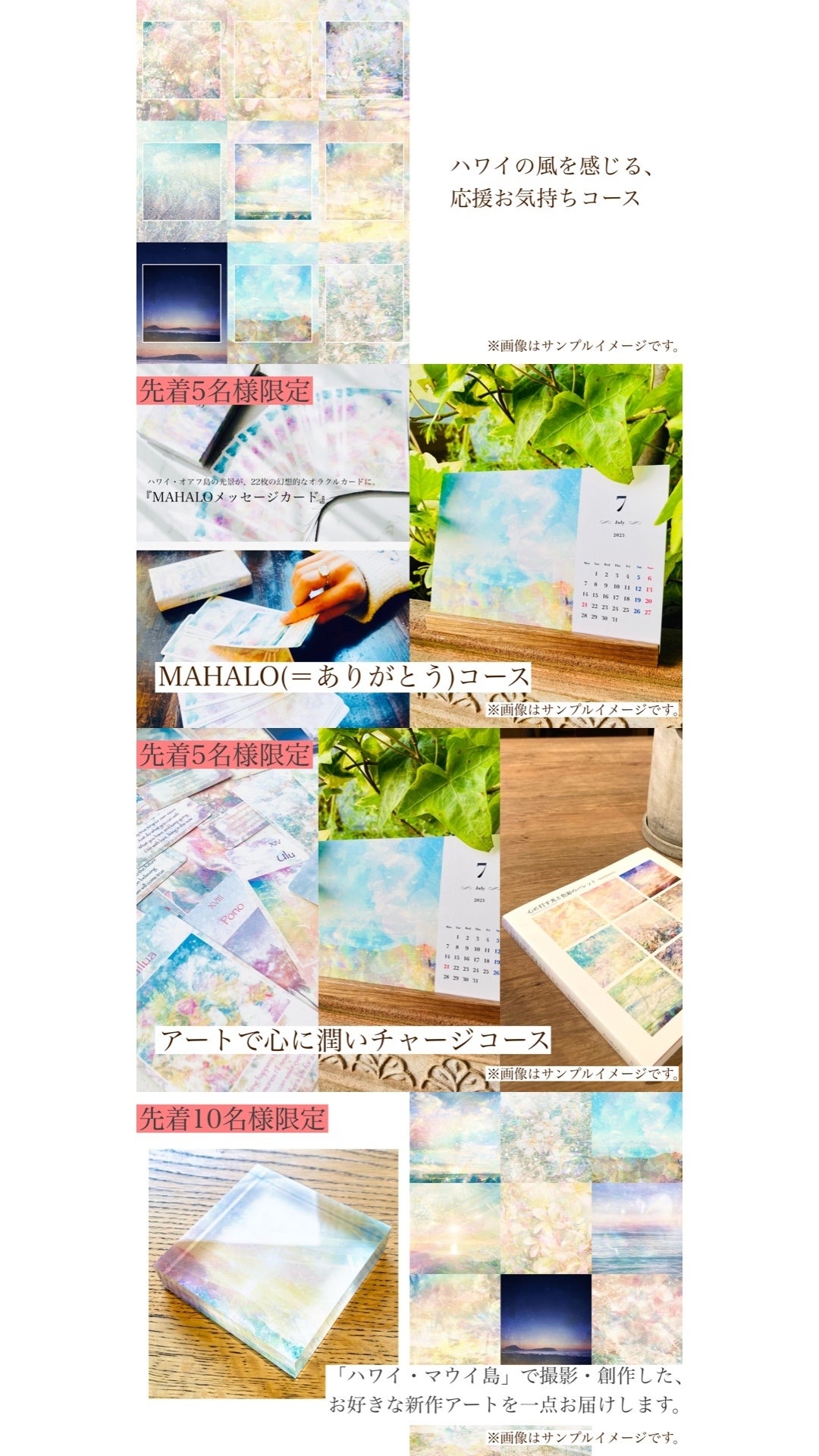 応援、ご支援におけるリターン(=返礼品)はどれもハワイの包み込むような優しさと温かさが伝わってくるアート作品を多数ご用意しています。。!