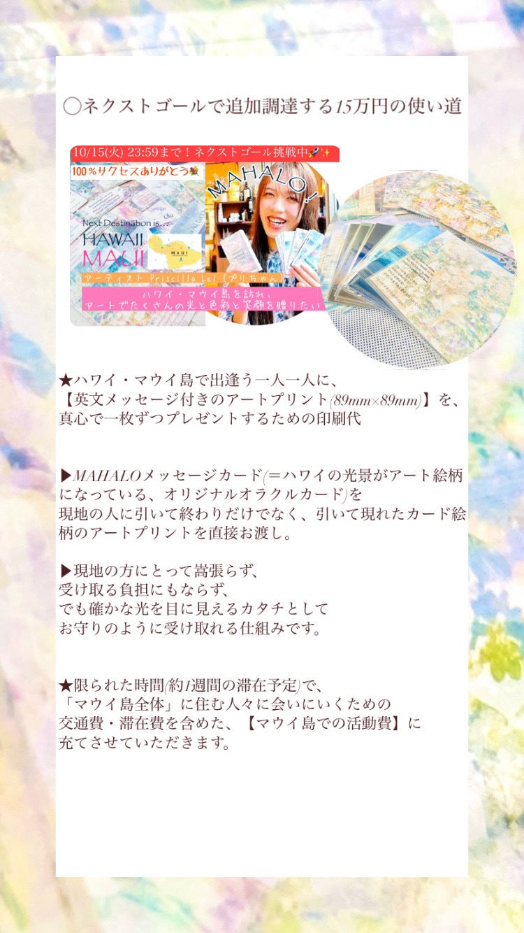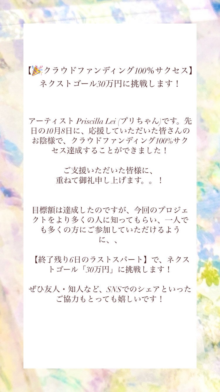 2024/10/15 00:29皆さん、こんばんは!アーティストPriscilla Lei (プリちゃん)です!私たちのクラウドファンディングも、残り24時間を切り、本日最終日となりました。。!これまで本当に応援をありがどうございます。お陰様で、【161%達成】となりました。。!!目標金額20万円をクリアしていますので、ご支援額にかかわらず、【ご支援者様全員】に、マウイ島の新作アートで創るオリジナル栞を【選択されたリターンとは別に、追加のギフト】としてお届けさせていただきます。。!(パチパチ)あらかじめアナウンスさせて頂いていた、「ネクストゴールの追加ギフト」は下記となります。ネクストゴール30万円達成も、あともう少しで届きそうですね。。!同時開催中の東京個展も、本日最終日。【11:00〜17:00】まで在廊がんばって、その後に搬出作業。それから、クラファンラストスパートに向けて発信など。最後の最後まで、想いを発信し続けていきますね!このラスト一日も、どうぞよろしくお願いします〜!!最大限、ベストを尽くしますね!!【クラファンの締め切りは、本日10月15日(火) 23:59まで。】Priscilla Lei (プリちゃん) もっと見る