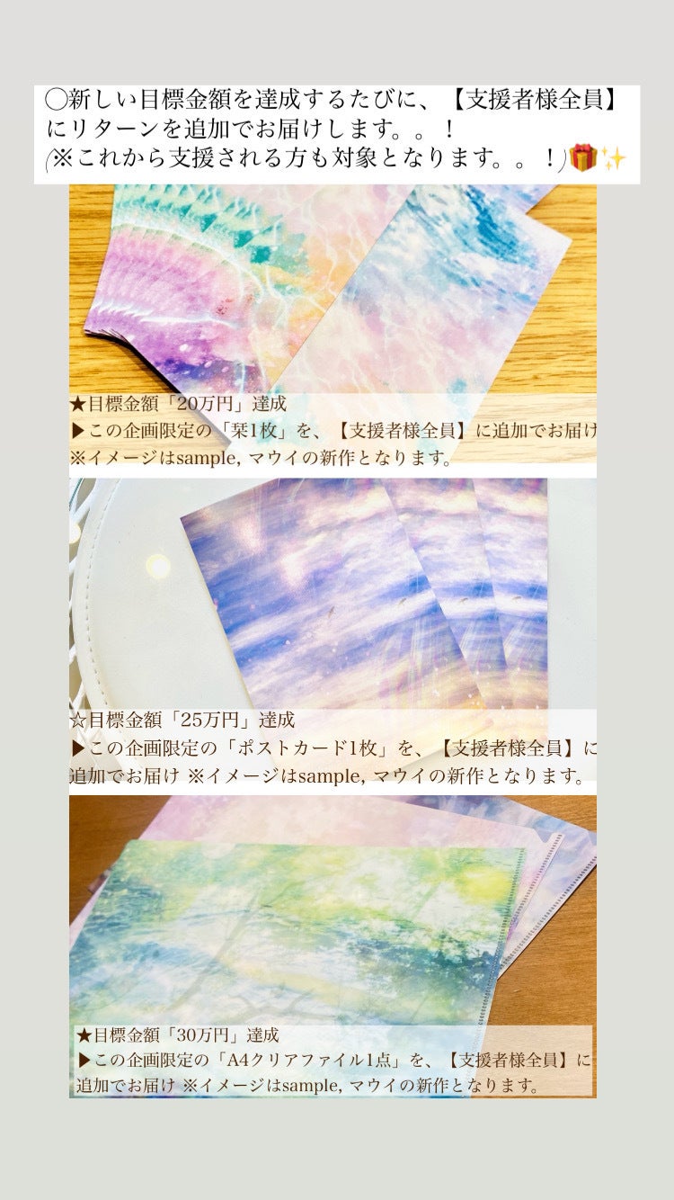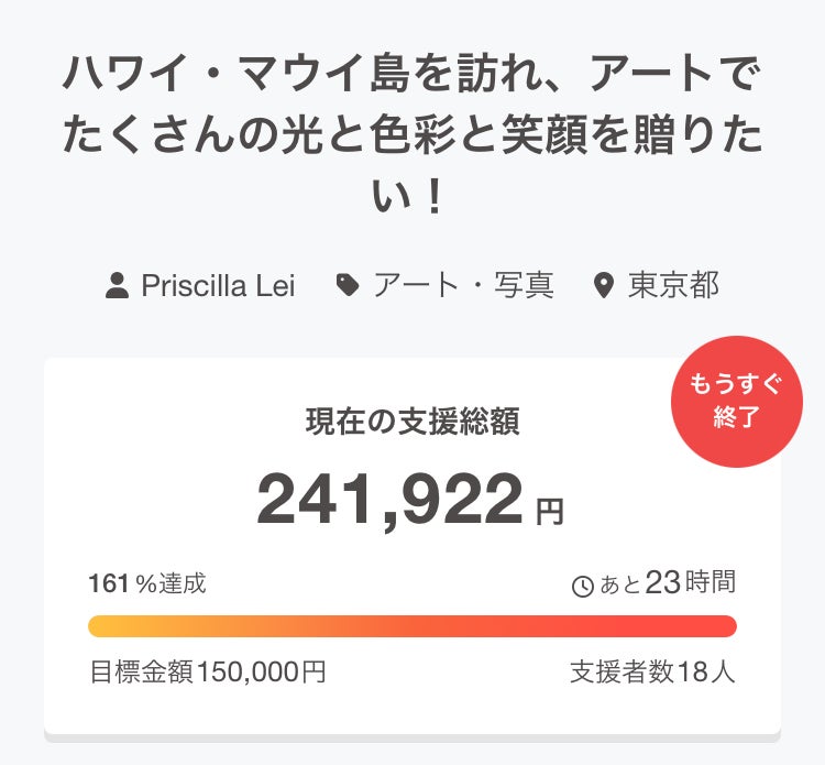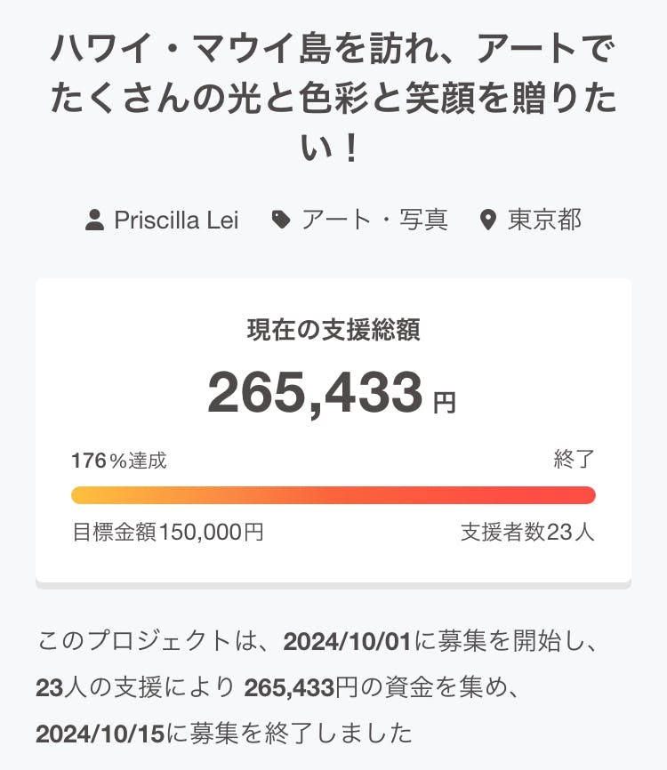 2024/10/16 00:40皆さん、こんばんは!アーティスト Priscilla Lei (プリちゃん)です!先程、無事に私たちのクラウドファンディングも終了しました!最後の最後に駆け込み支援が続きまして、【176%サクセス】で最終着地となりました。。!ご支援いただいたお一人お一人のお陰様です。。!本当に本当に、ありがとうございます!また、「ネクストゴールの追加ギフト」に関してですが、予め目標にしていた30万円には届かずでしたが、25万円を達成できました!!!そのため、”支援額・選んだリターンに関わらず”、【マウイ島で撮影・創作した新作を用いたオリジナル栞1枚+ポストカード1枚】を、【支援者様全員】にお届けさせていただきます。。!!(パチパチ)※この追加ギフトのお届けは、2025年1月中となります。新年明けて、ご到着をお楽しみにされてくださいね♪10月1日〜10月15日にかけて、約2週間。個展とクラファンのW挑戦も、みんなのお陰で盛況で終えることができました。。!本当にありがとうございました。。!遠方にお住まいの方も、この期間中少しでもワクワクドキドキを楽しんでいただけたら、本当にトライしてよかったなぁと思います♪今後の活動報告につきましては、、、日々のインスタ投稿・ストーリー、そしてcampfireさんの活動報告にて発信します。選択していただいたリターン発送は基本的に、年明け2025年過ぎてからとなりますので、よろしくお願いいたします。ひとまず、やり切った感が大きいので、うまく休みながら、次に向けて進んでいきますね♪明日以降も素敵な一日をお過ごしくださいね。。!Priscilla Lei (プリちゃん) もっと見る