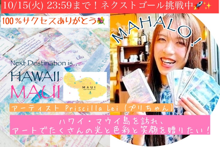 2024/12/23 17:53Aloha ! みなさん、こんばんは!アーティスト Priscilla Lei(プリちゃん)です。まもなくクリスマス、皆様いかがお過ごしでしょうか?私のインスタでシェアしていましたように、先週12月16日〜12月18日まで、ずっと望んでいたハワイ・マウイ島でプロジェクトを実施。被災地・ラハイナをはじめとする、マウイ現地の方々にアートとメッセージを直接お渡しさせていただくことができ、喜んでいただくことができました。。!(下記リンクは、インスタ投稿記事。マウイの風景写真と共に、想いたっぷりの記事をご覧いただけます。)【マウイ島プロジェクト投稿①】https://www.instagram.com/p/DDrfqOgppoq/?igsh=MW1mcWt0b240dW5lYw==【マウイ島プロジェクト投稿②】https://www.instagram.com/p/DD1Zb0PSD9M/?igsh=cDRsNDZnb3g0a25lこの2024年12月に、ハワイ・マウイ島へ足を運べたこと。それは、これを読んでくださっているお一人お一人が、私の想いに共鳴し、応援して頂いたお陰様です。。!マウイ現地の方々の笑顔。。これも、ご支援して頂いた皆さんのお力添えも含まれています。私だけでは、この笑顔を見て、みなさんにシェアすることはできなかった。。心の奥底から、ご支援して頂いたお一人お一人に、深く感謝いたします。本当にありがとうございます。。!また、マウイの美しい自然から産まれたMAHALOシリーズの新作アート。先日からInstagramにて1作品ずつupしている最中です。是非このホリデーシーズン、年末年始にご覧くださいね♪https://instagram.com/priscillalei0000【リターンのお届けに関して】現在、リターンのお届けに向けて絶賛準備をしております。ネクストゴール達成のため、「ご支援者様全員」にハワイ・マウイの新作アートによる、「ポストカードと栞をお贈りします。。!★「フォトアクリルキューブ」をオーダー頂いた方▶︎1月中旬までに、マウイ新作22点の発表後、お好きな一点をピックアップ。(インスタDMなど、個別でやり取り) アクリル制作に入り、【2月中】にお届け。★「オーダーアートMAKANA」をオーダー頂いた方▶︎1月中にヒアリング・打ち合わせ、創作▶︎2月中にフォトアクリル仕上げでお届け★上記以外のリターンを選択した方▶︎【2025年1月中】にお届けいたします。ご到着まで今しばらくお待ちくださいね♪いつもありがとうございます。。!素敵な年末年始を過ごしていきましょうね。。!Priscilla Lei (プリちゃん) もっと見る
