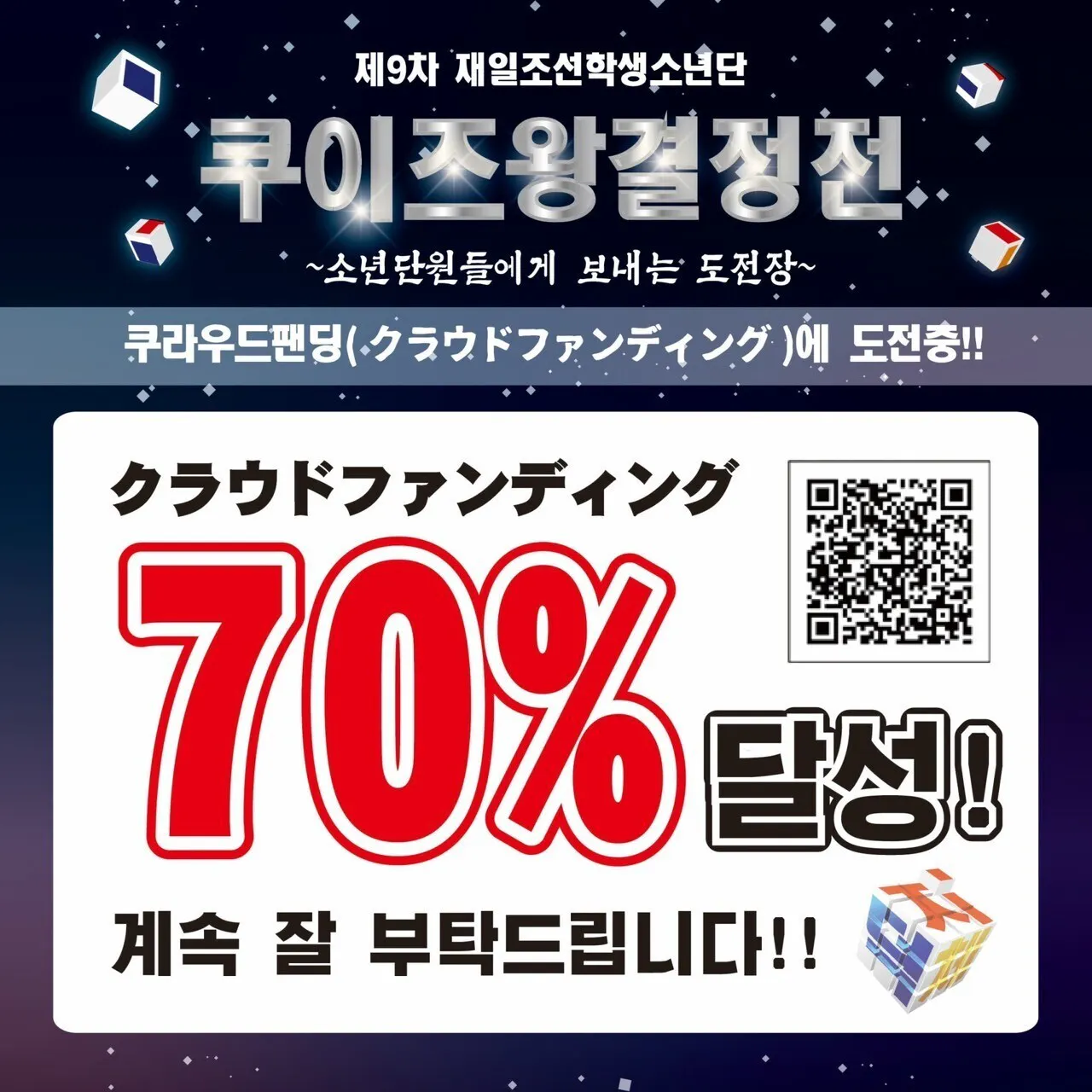 2024/11/06 15:17アンニョンハシムニカ!クラウドファンディングも残り2日となりました。ここ数日は特に盛況で目標達成も目前となってきました。最後までよろしくお願いします!さて、本戦10日前となりましたが、事務局では準決勝、決勝の準備を進めております。装飾品の作成から舞台配置の考案、脚本作成、生放送の準備と大忙し(^^;)私も小学生の決勝問題解いてみましたが…難しすぎます。当日はぜひ!決勝の生放送をご覧ください!△生放送概要・初級部決勝:11月16日 15時~・中級部決勝:11月16日 15時45分ごろ~※URLはメールにてご支援いただいた方へ送信いたします。クイズ王決定戦の成功とクラウドファンディング100%超過目指して引き続き頑張っていきます! もっと見る