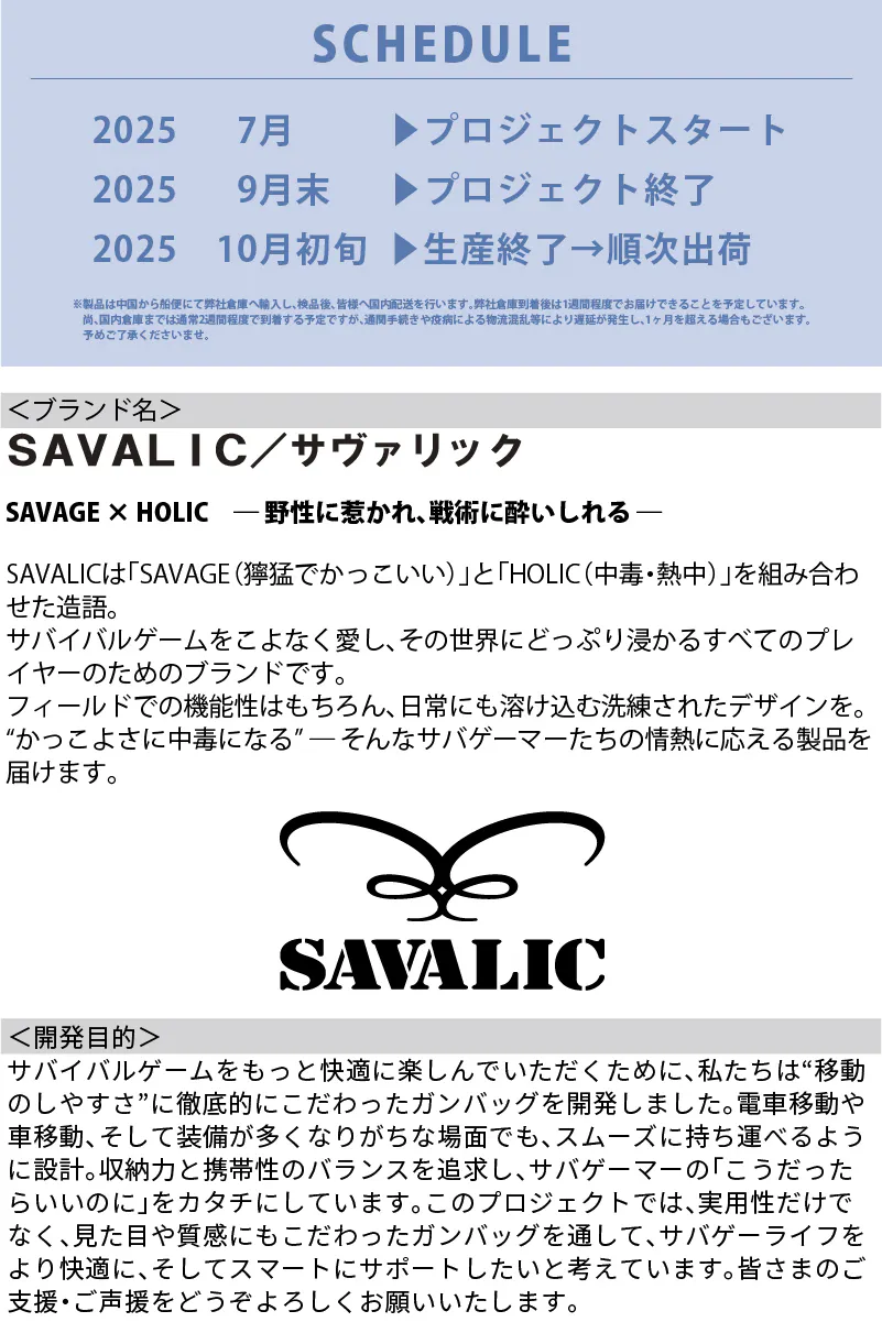2025/10/01 11:19昨日をもちまして、クラウドファンディングの募集を無事に締め切らせていただきました。この一か月余り、多くのご支援を賜り、心より御礼申し上げます。いただいたご支援金は、すべて開発部材費として大切に活用させていただきます。大荷物を抱えての往復の煩わしさを少しでも軽減したい──その思いから開発した「ガンバッグType83」。バッグと共にサバゲーを楽しみ、素敵な思い出も一緒に詰め込んでご帰宅いただけることが、私の何よりの願いです。改めまして厚く御礼申し上げます。商品は明日より順次発送を開始いたしますので、どうぞ楽しみにお待ちください。今後とも変わらぬご愛顧を賜りますよう、よろしくお願い申し上げます。 もっと見る